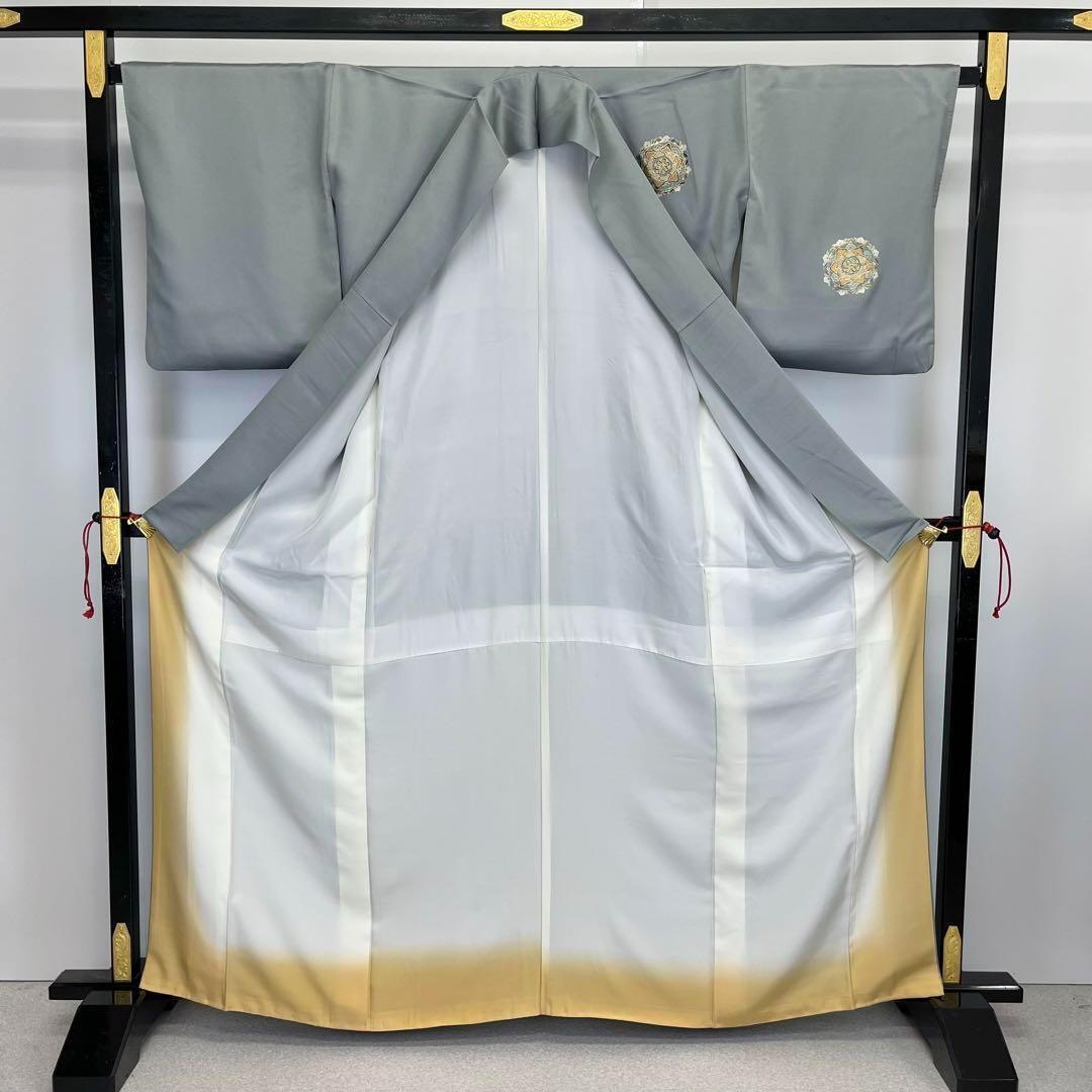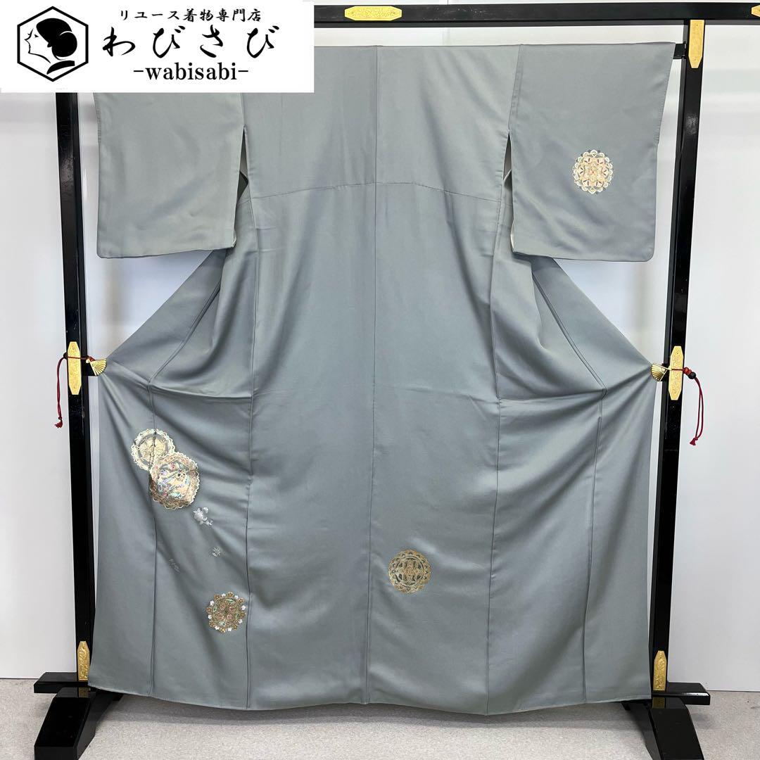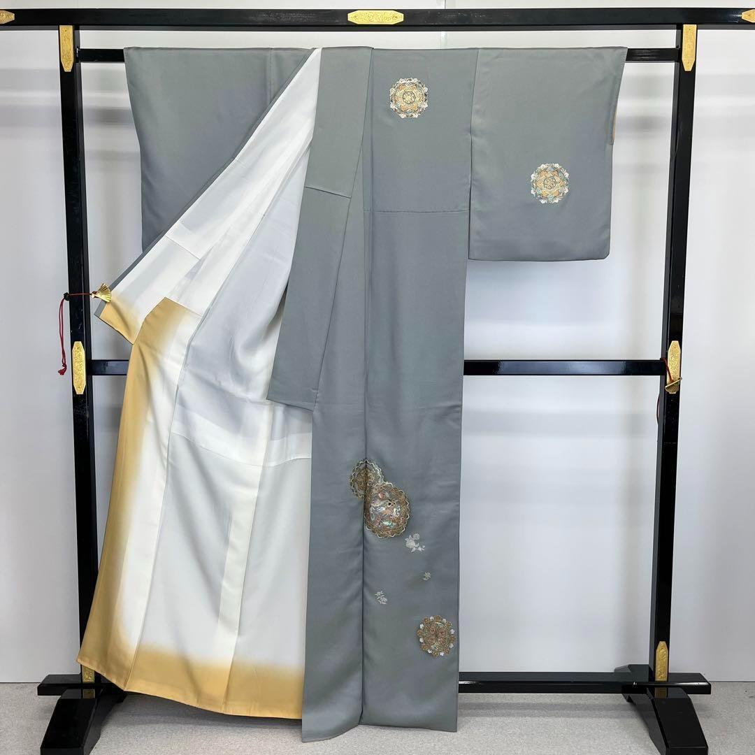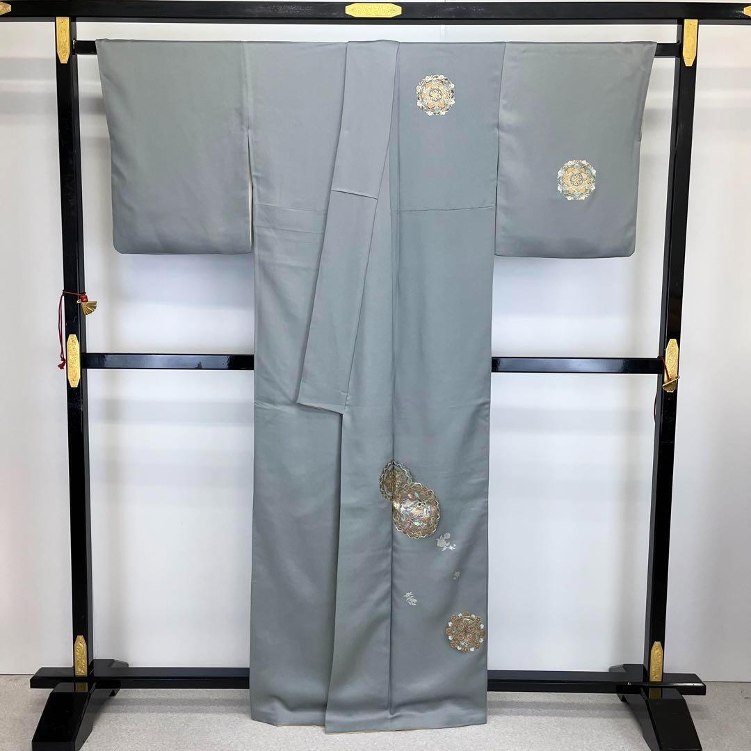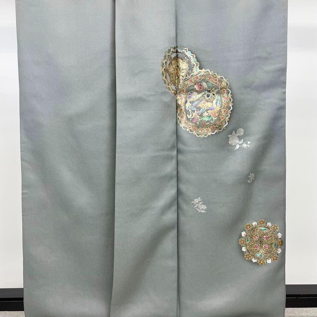 薄青鈍色の落ち着きのあるお色味に美しい金銀彩、螺鈿が使われた煌びやかな花柄に鳥模様の柄裄がデザインされた素敵なお品でございます。