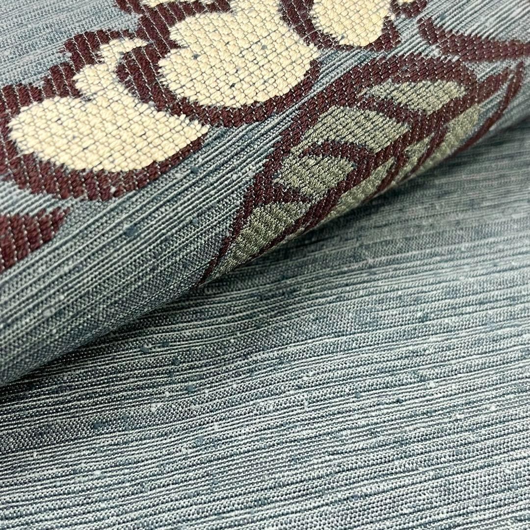 納戸鼠色の紬、四角に花鳥柄の可愛らしい柄裄がデザインされた素敵なお品でございます。