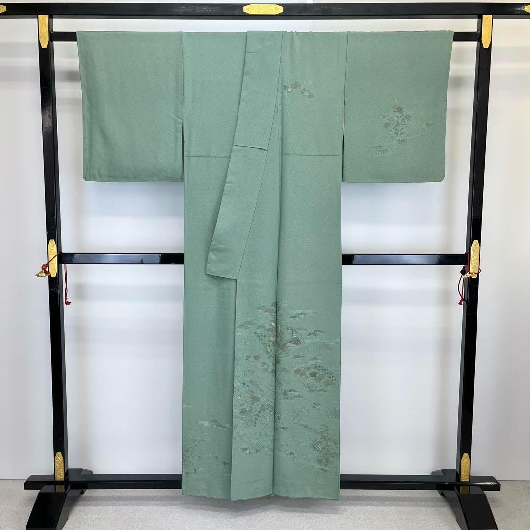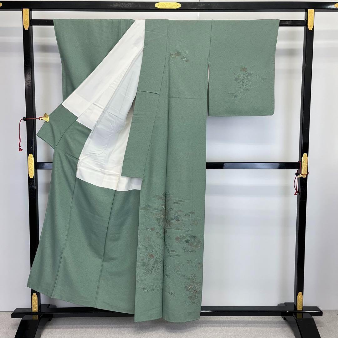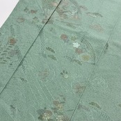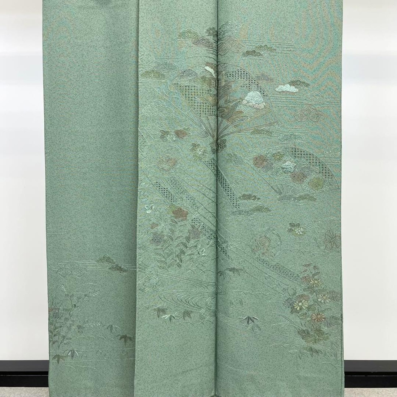 錆青磁色の上品なお色味に汕頭刺繍、相良刺繍、蘇州刺繍でデザインされた扇に四季の花柄模様、雪輪に亀甲の柄裄が素敵なお品でございます。