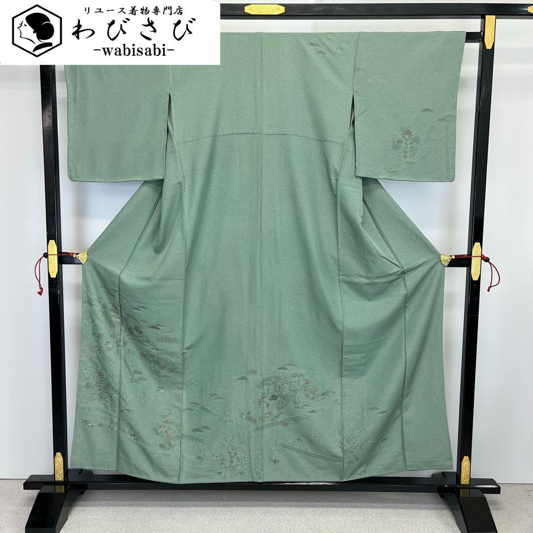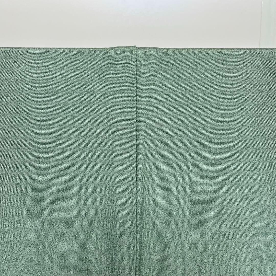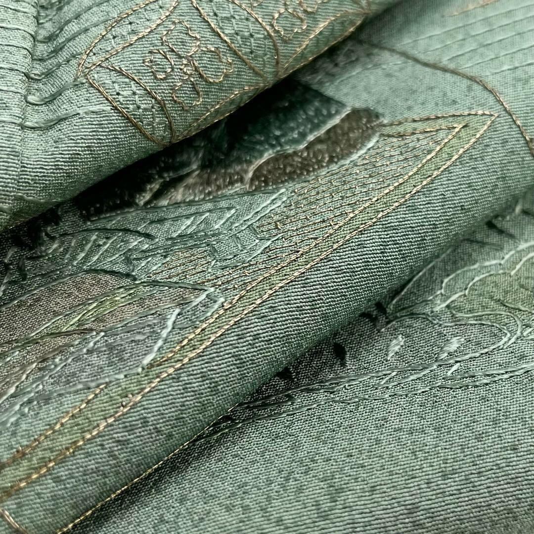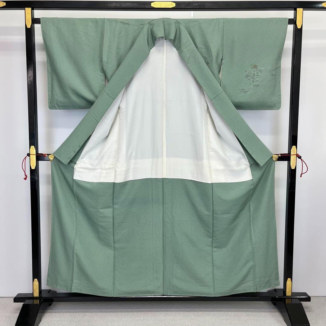 錆青磁色の上品なお色味に汕頭刺繍、相良刺繍、蘇州刺繍でデザインされた扇に四季の花柄模様、雪輪に亀甲の柄裄が素敵なお品でございます。