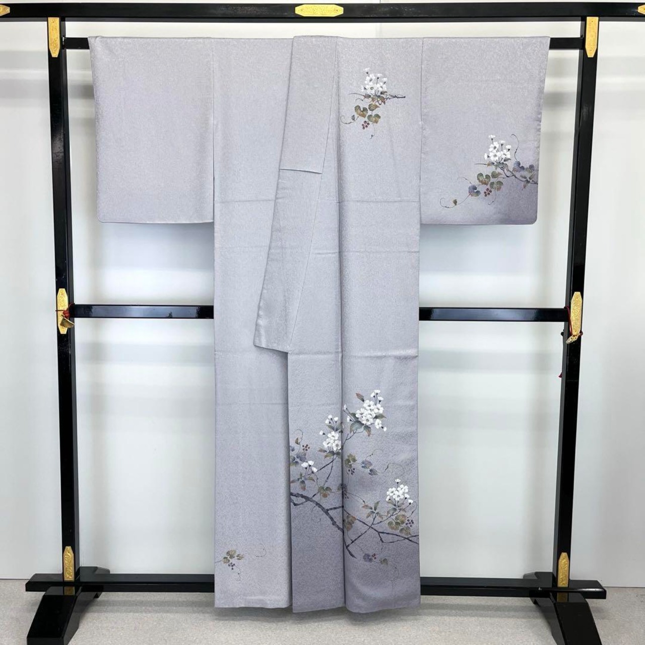 鈍紫色の上品なお色味に暈し、桜の花、葡萄の枝花模様が手描きでデザインされた素敵な柄裄のお品でございます。