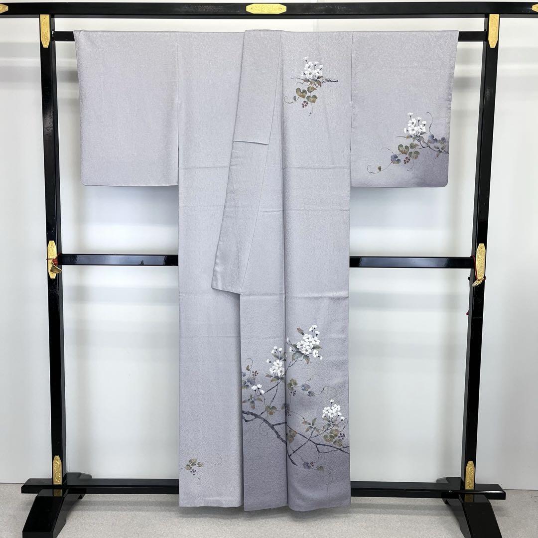 付下げ 手描き 枝花模様 桜 葡萄 縮緬 暈し 鈍紫色 K-3759