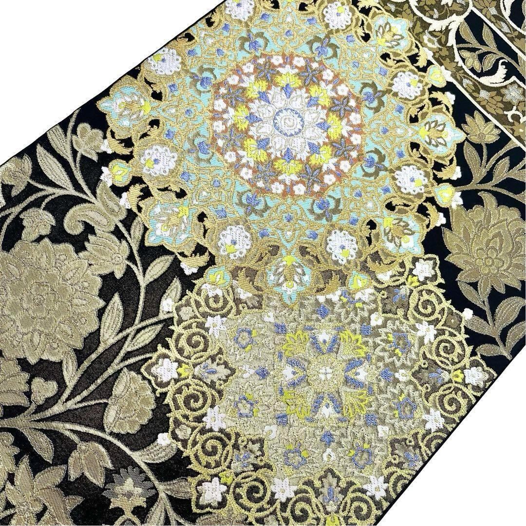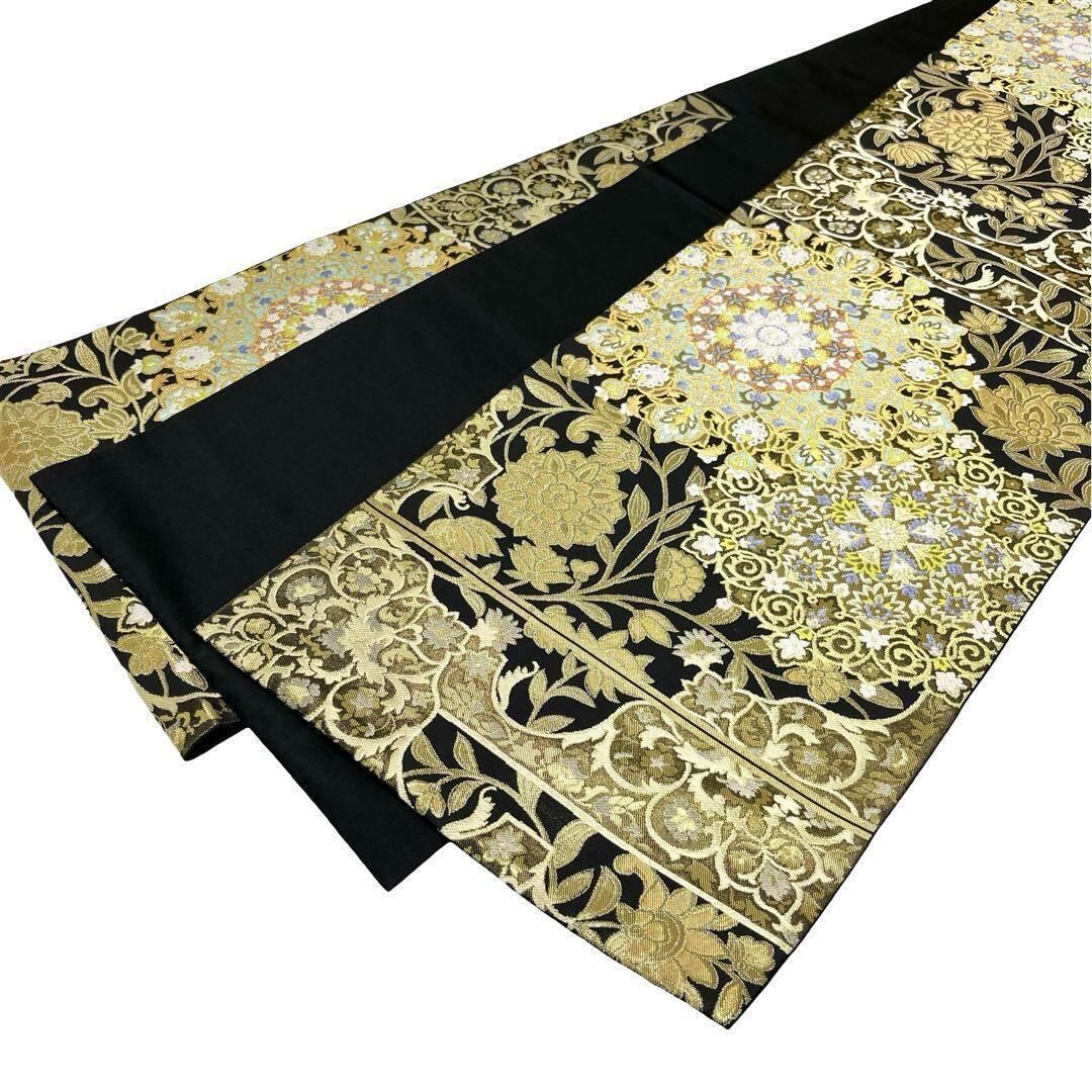 袋帯 煌びやかな華柄模様 花唐草 金糸 黒色 O-3805
