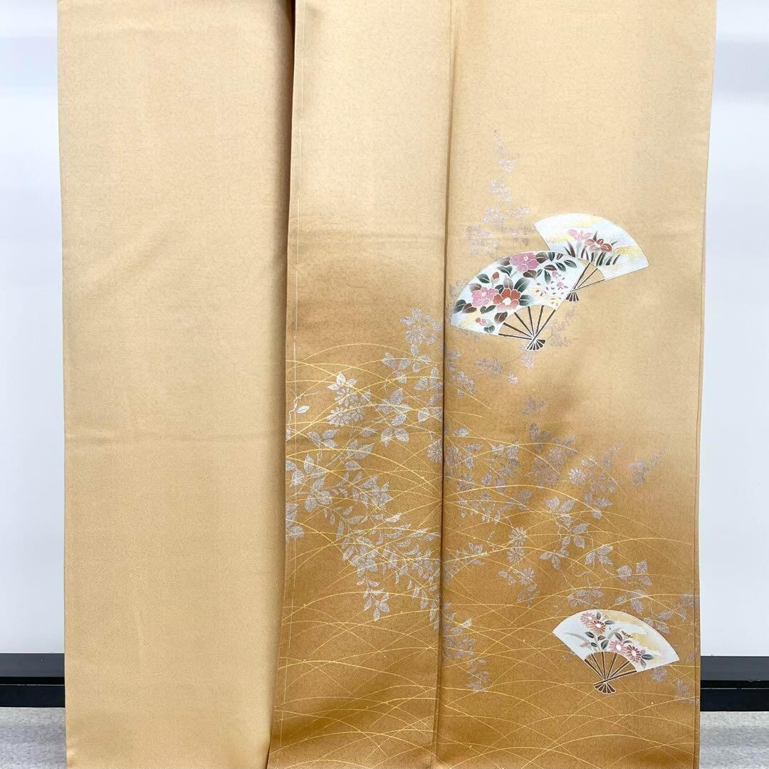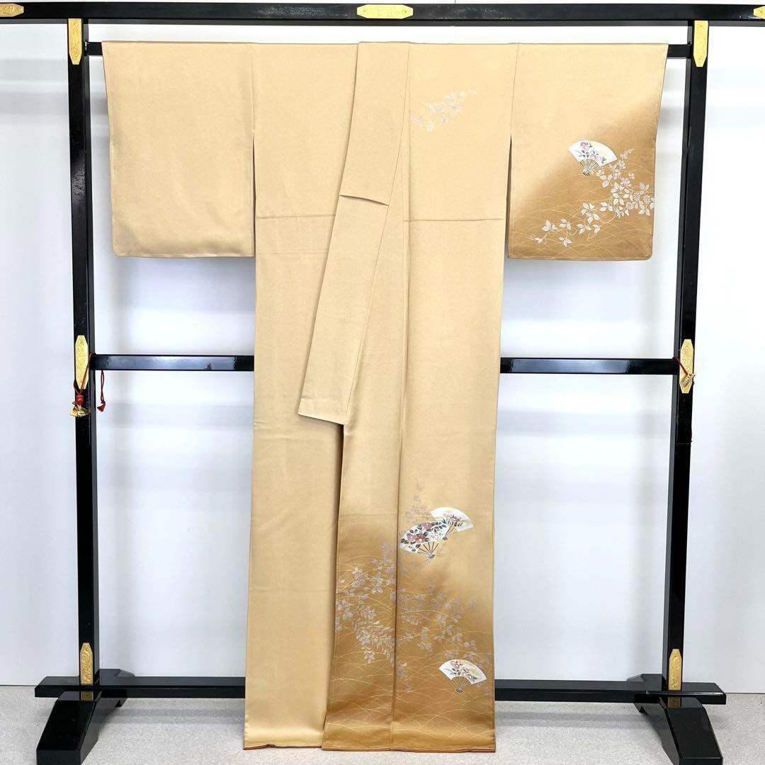 付下げ 扇子に花柄 芝模様 金銀彩 暈し 薄丁子色 トールサイズ K-3771