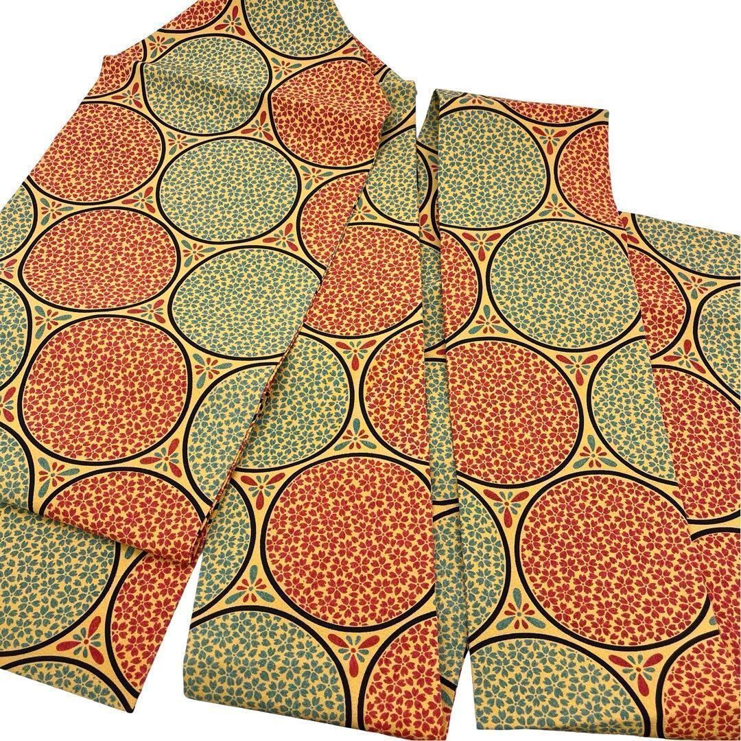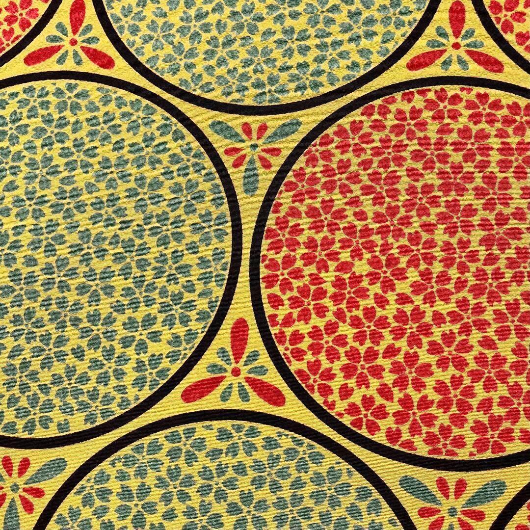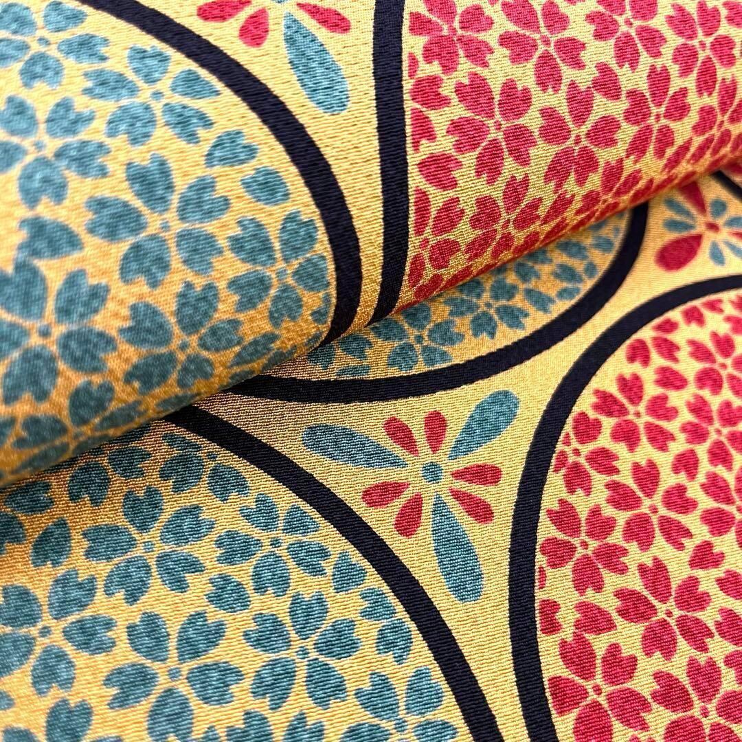 黄土色の縮緬に丸の中に桜の花模様がデザインされた素敵な柄裄のお品でございます。