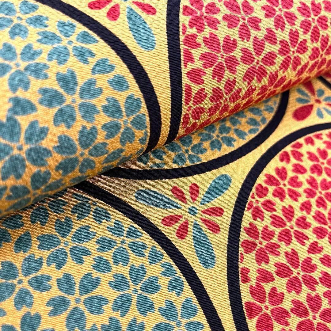 名古屋帯 丸に桜の花模様 縮緬 黄土色 O-3815 着物 きもの kimono 和服 和装 中古 リサイクル着物 【送料無料】