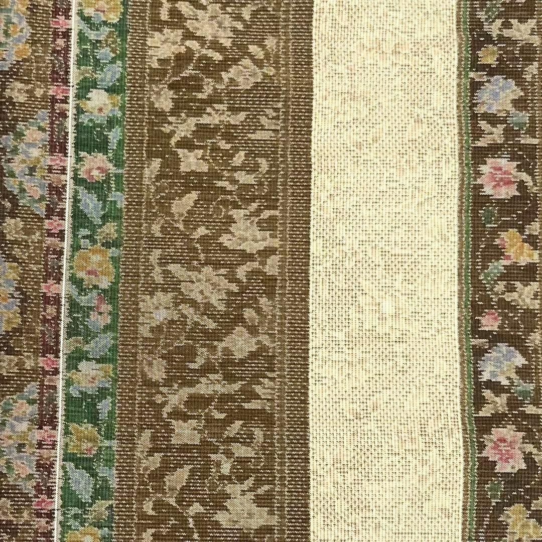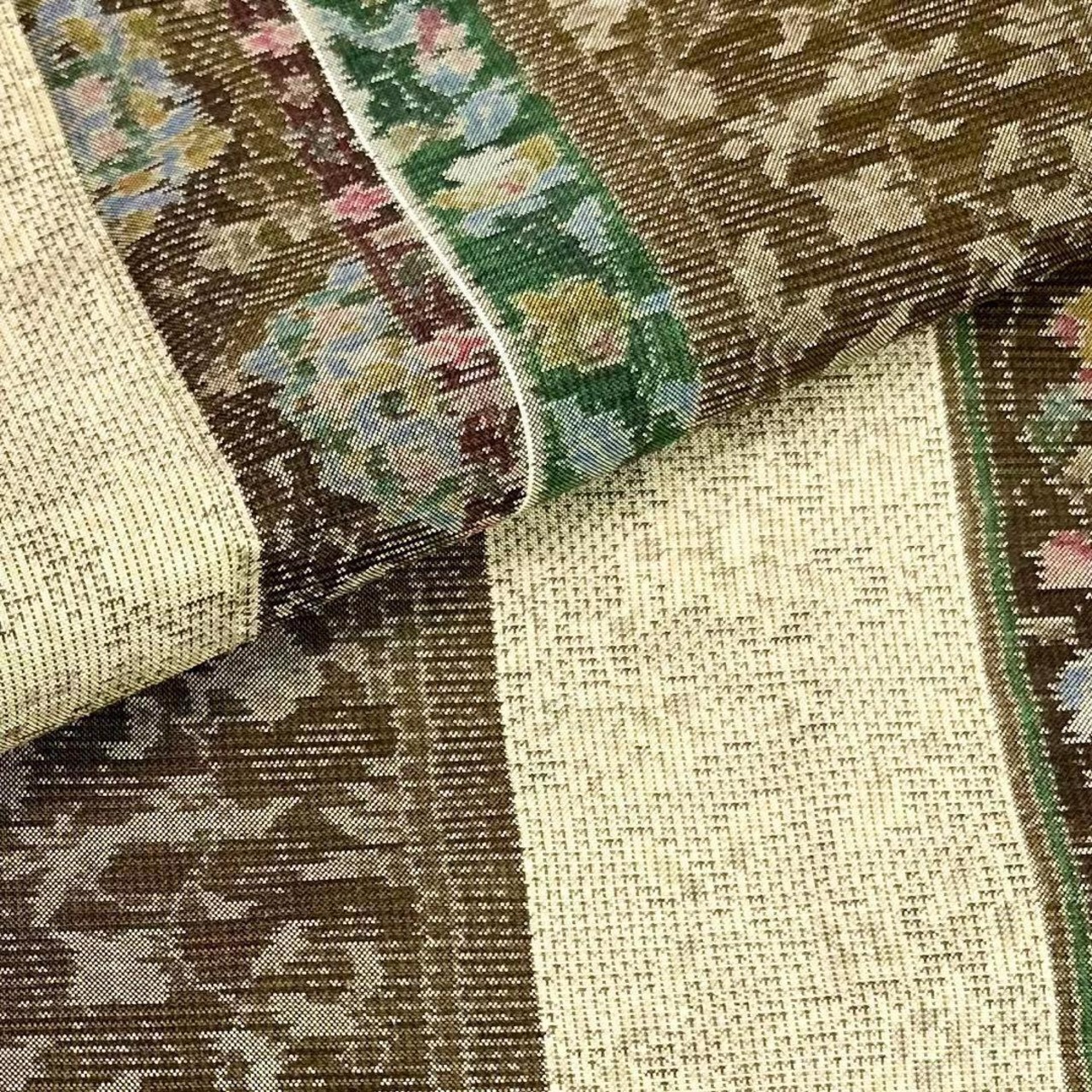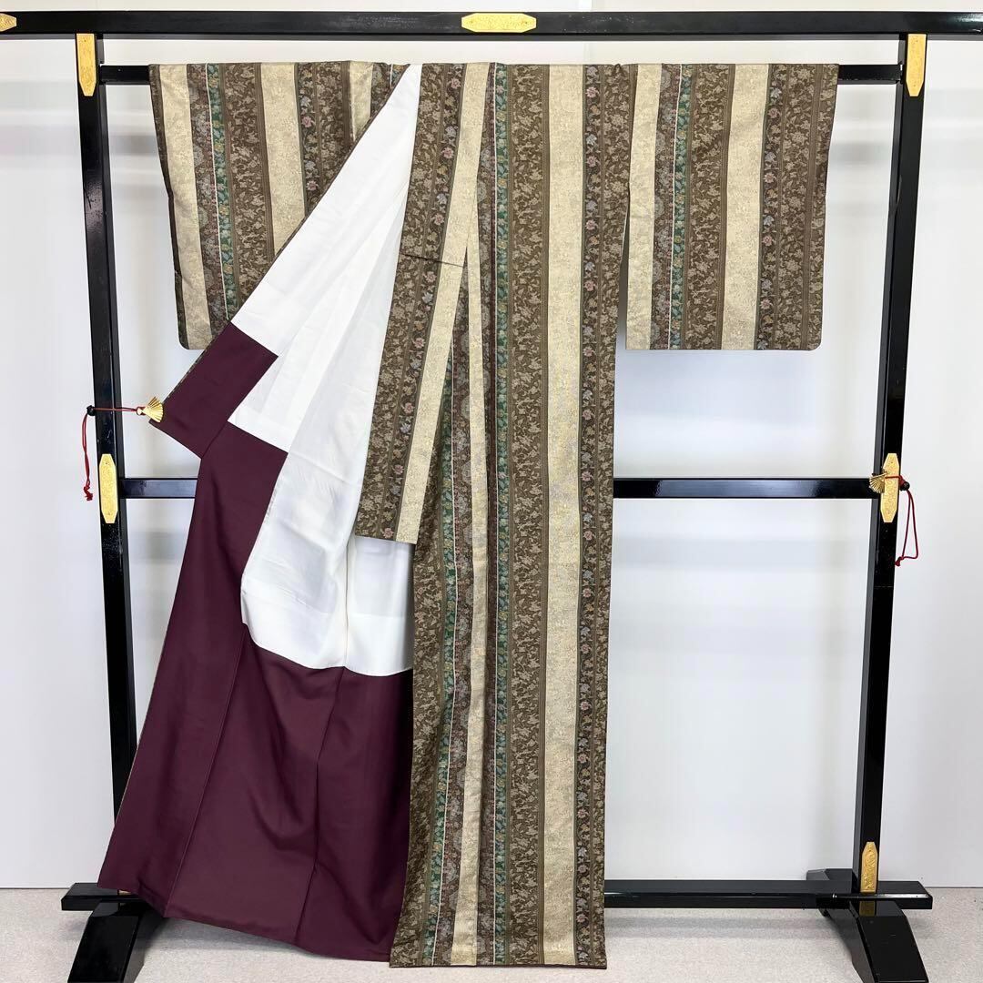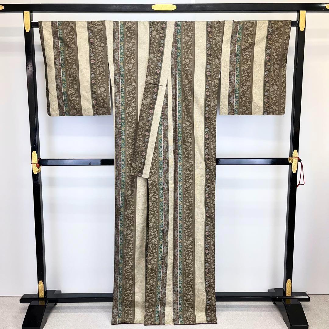 錆利休色ベースの美しい縦柄の花模様がデザインされた素敵な柄裄のお品でございます。