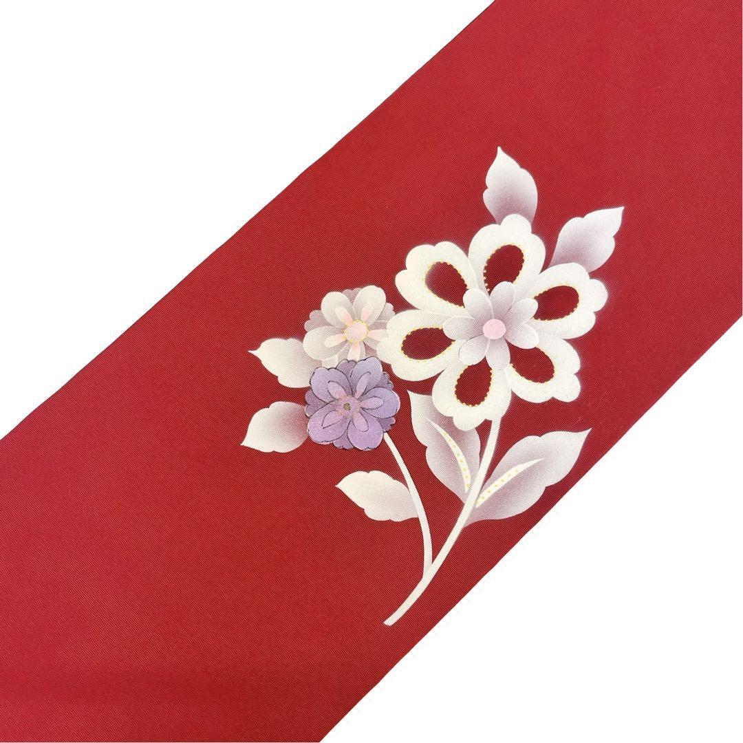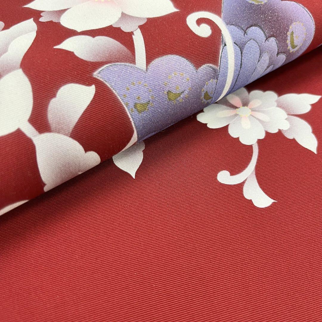 鮮やかな赤色の塩瀬に美しい花模様に蝶々の柄裄がデザインされた素敵な柄裄のお品でございます。