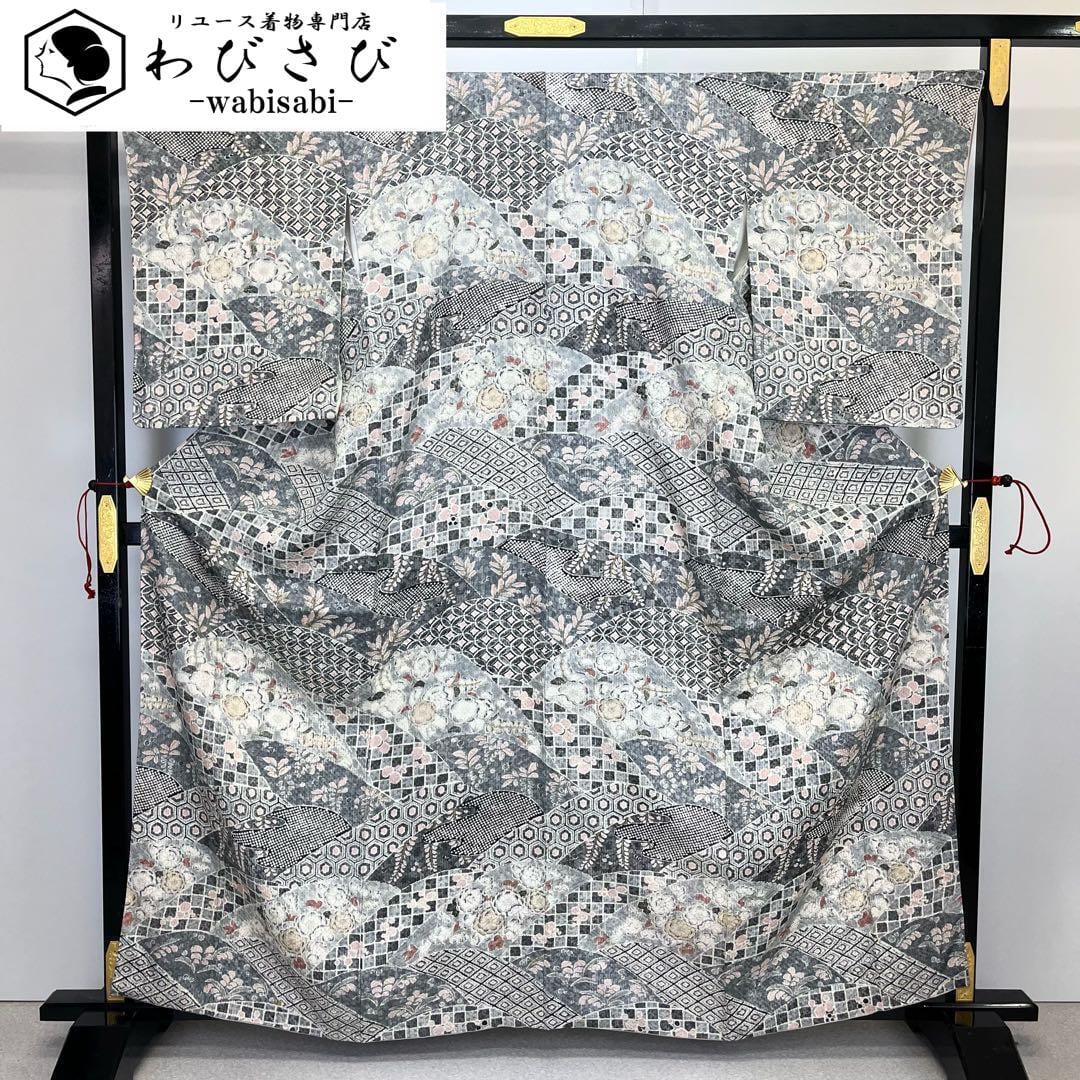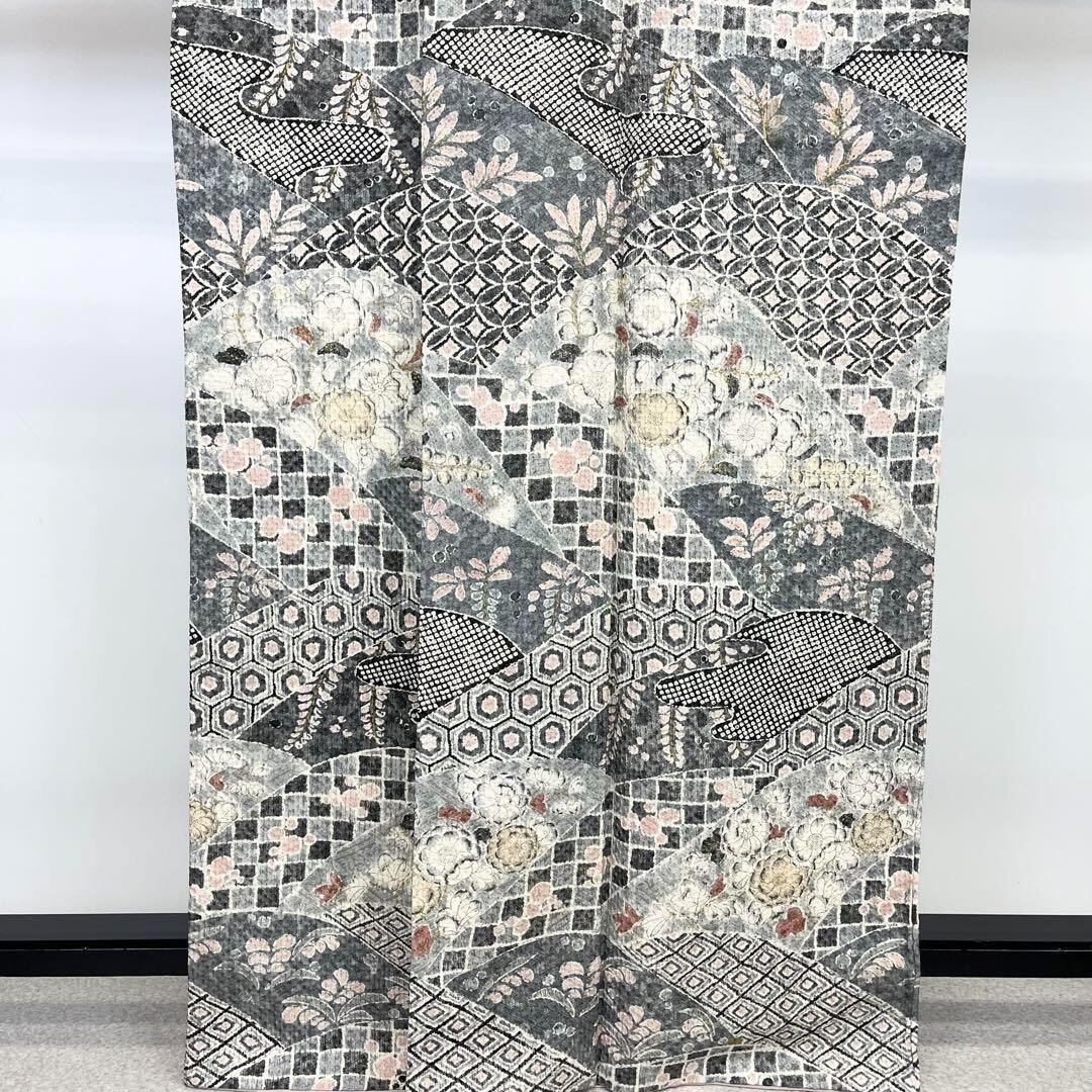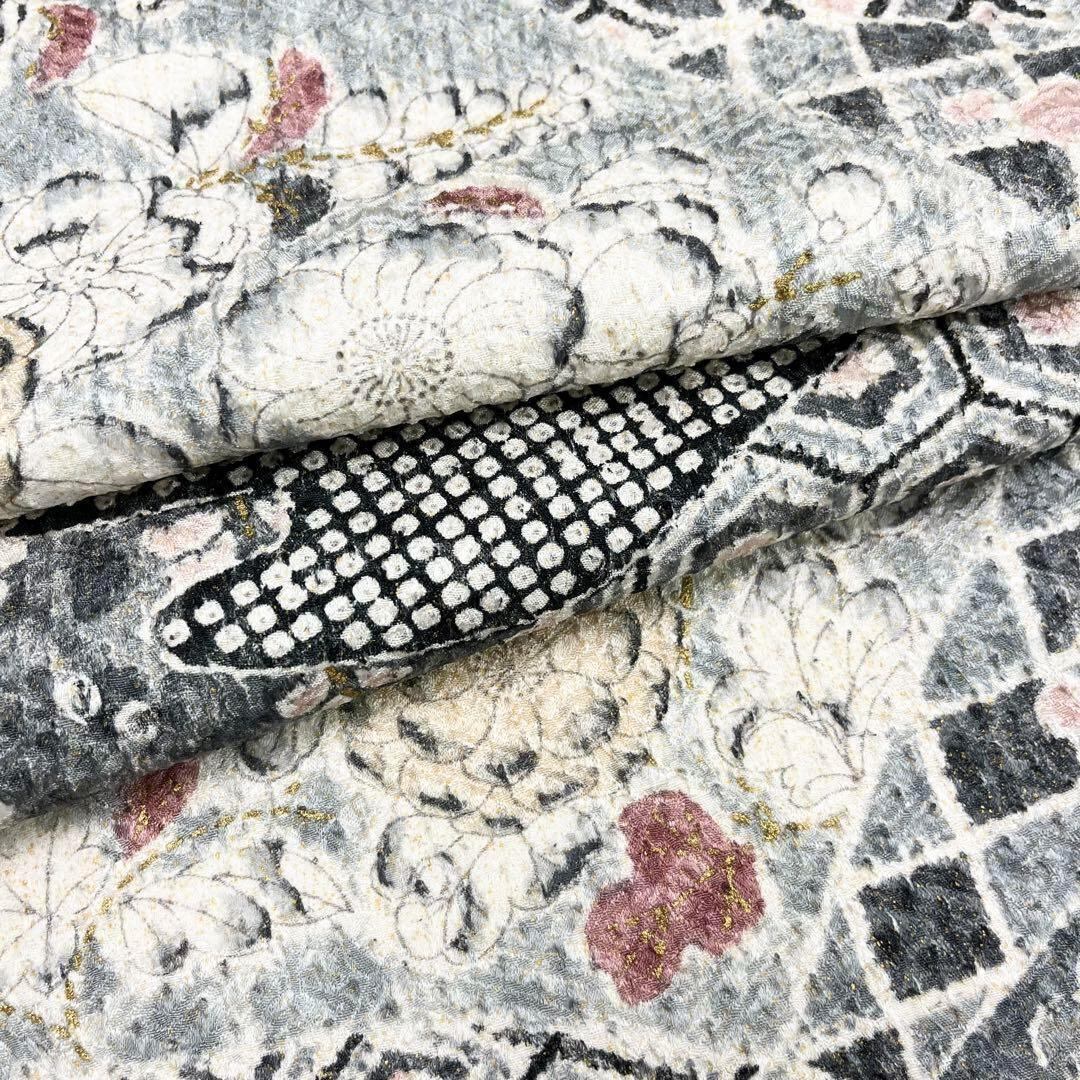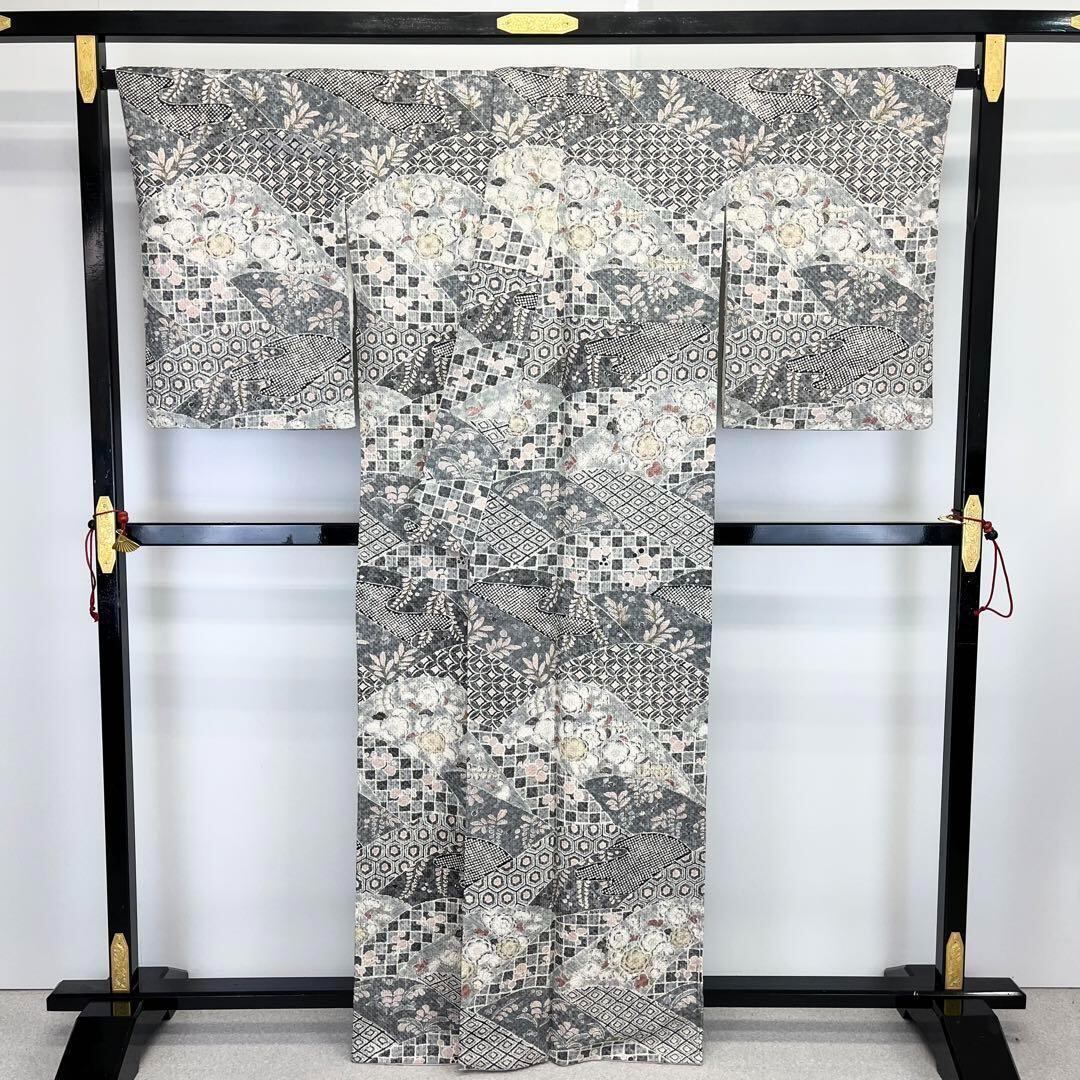 乳白色ベースのお色味、辻が花柄ベースの寄せ柄デザインの素敵な柄裄のお品でございます。