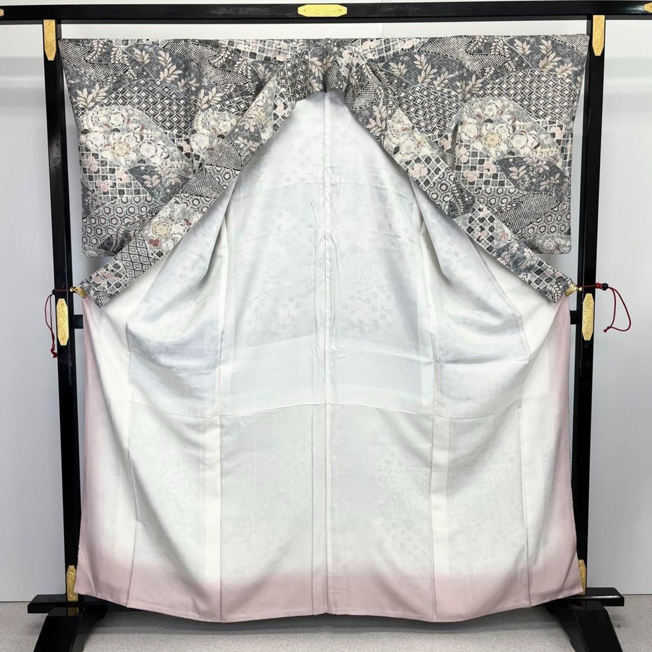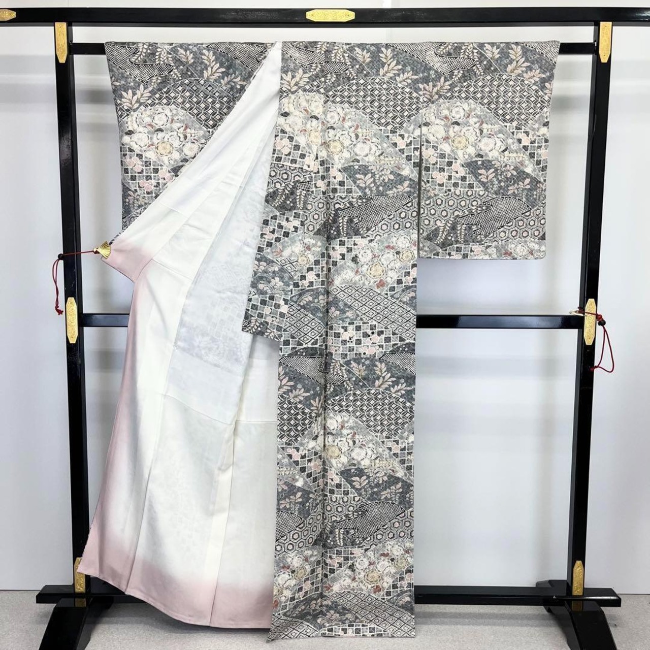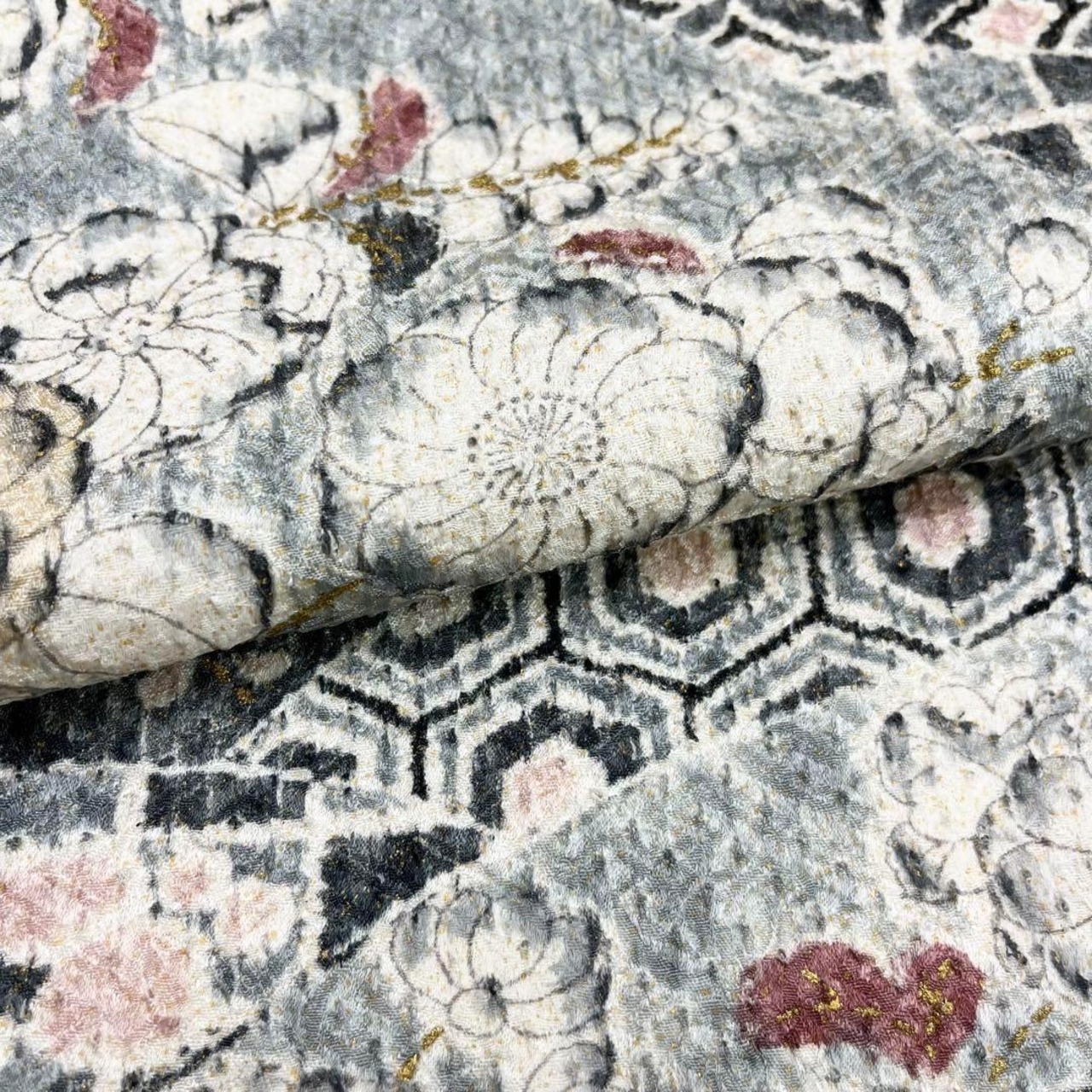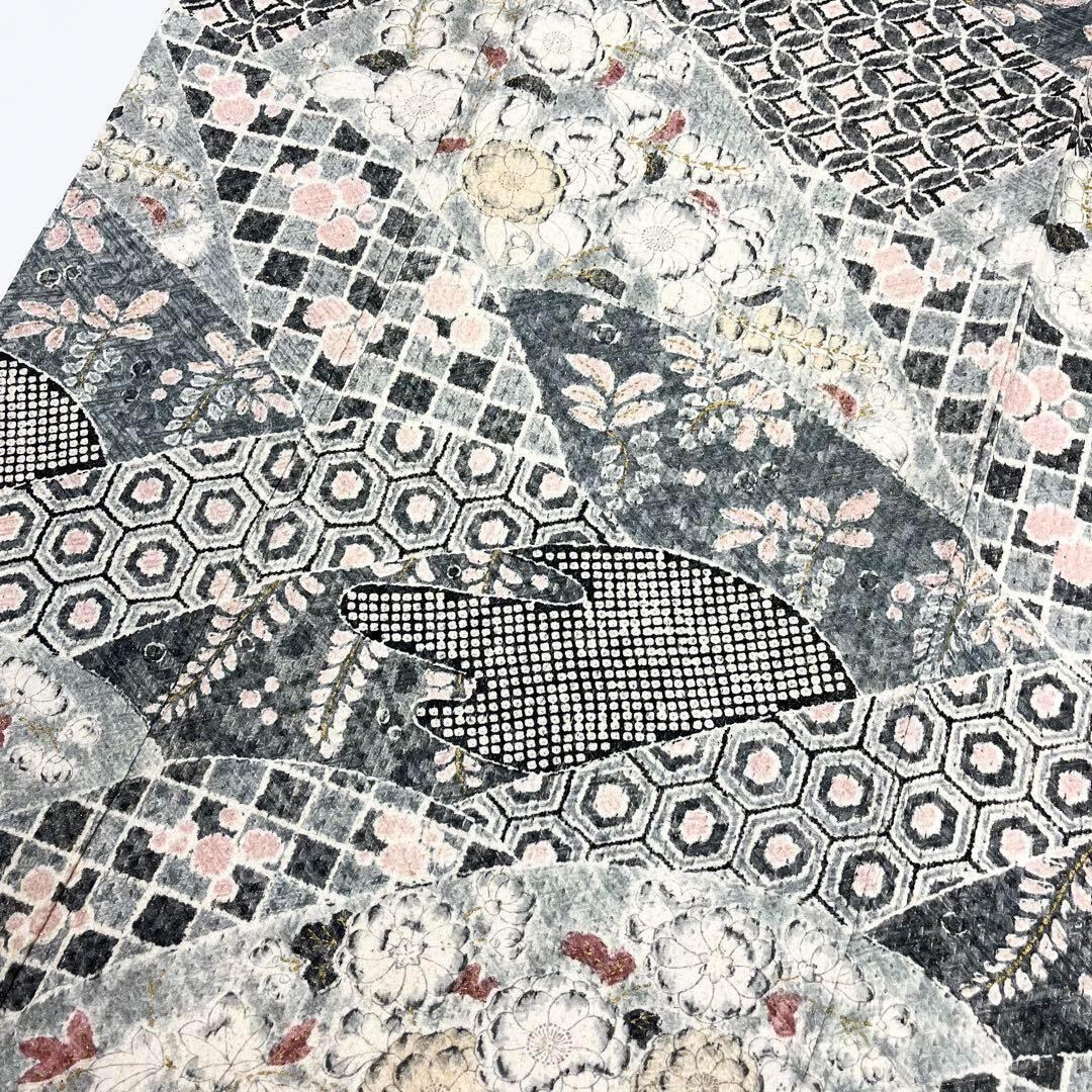 乳白色ベースのお色味、辻が花柄ベースの寄せ柄デザインの素敵な柄裄のお品でございます。