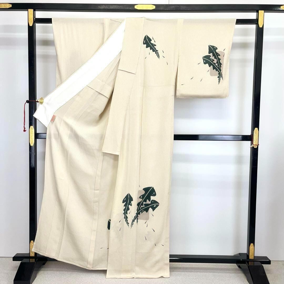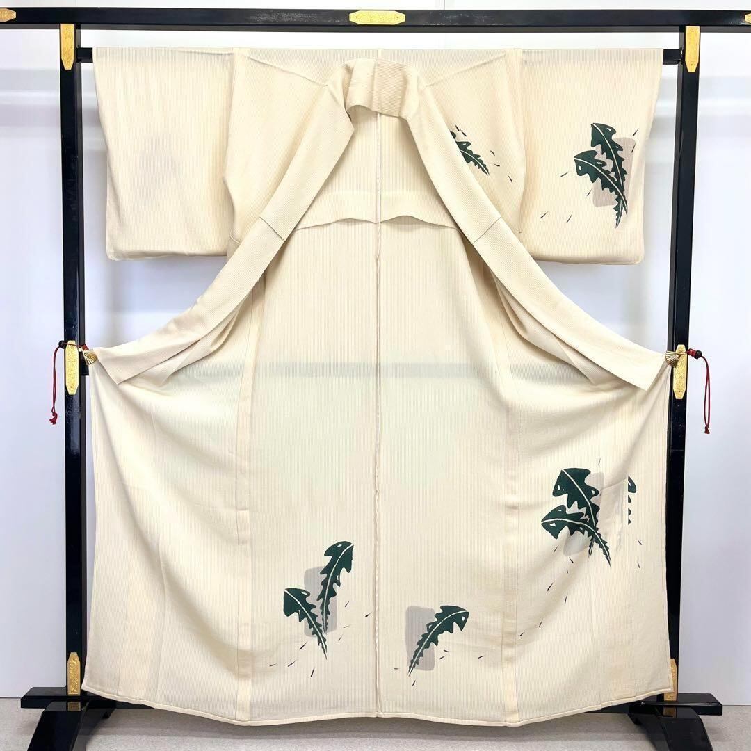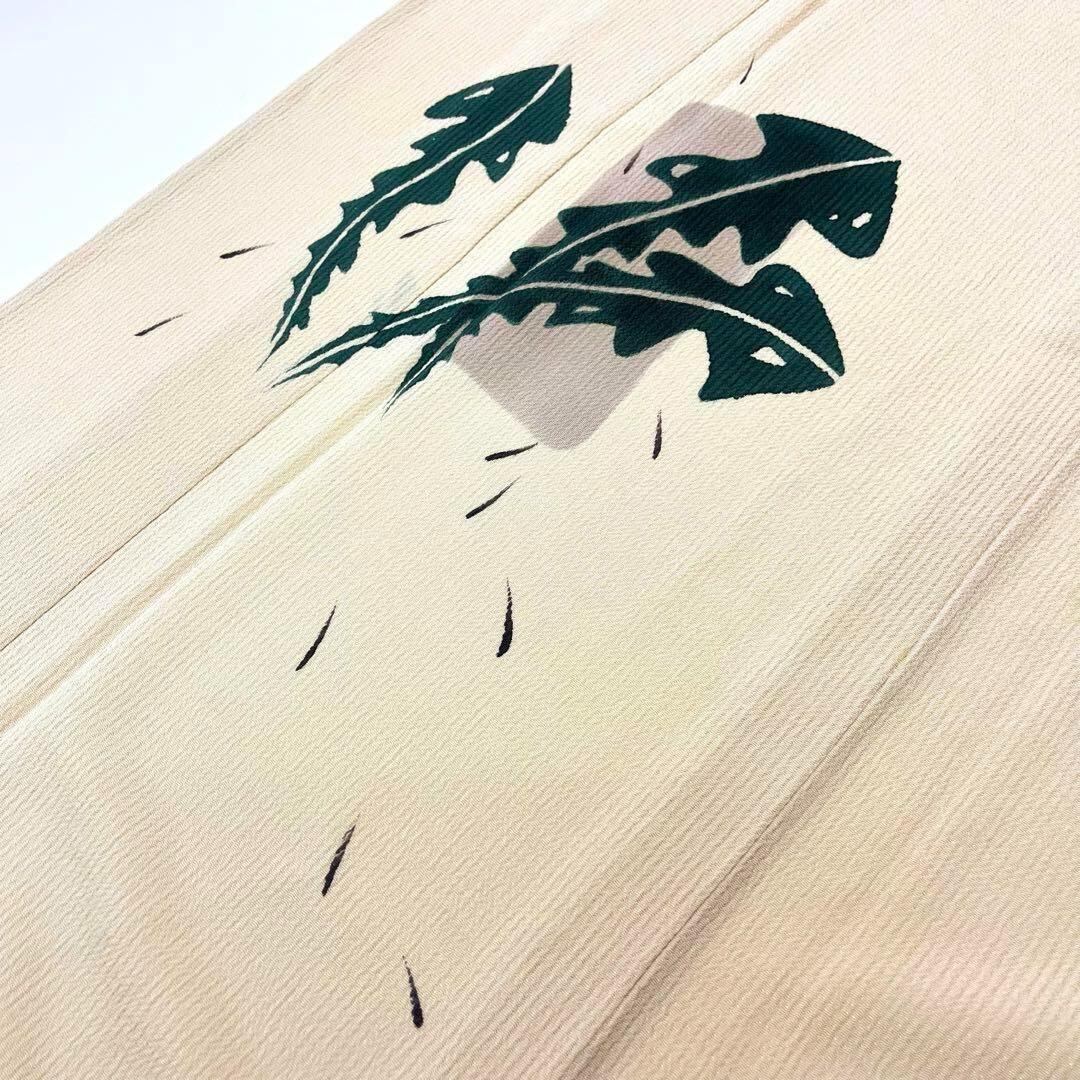 生成色の上品なお色味の柔らかい縮緬に水草にメダカ柄がデザインされた風流な柄裄のお品でございます。