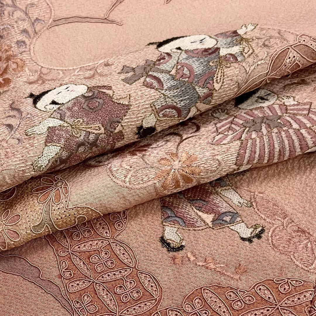 曙色の縮緬に暈し、全て刺繍でデザインされた童子、七宝繋ぎ雲模様などの柄裄が素敵なお品でございます。