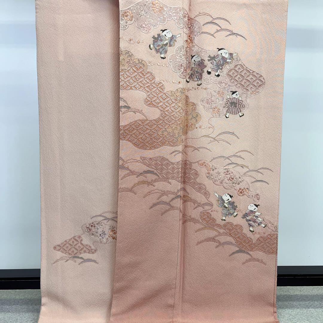 付下げ 刺繍柄 童子 七宝繋ぎ雲模様 暈し 縮緬 曙色 しつけ糸 K-3776 着物 きもの kimono 和服 和装 中古 リサイクル着物 【送料無料】