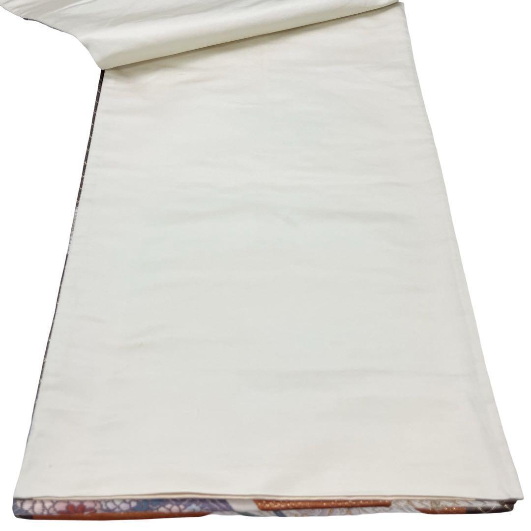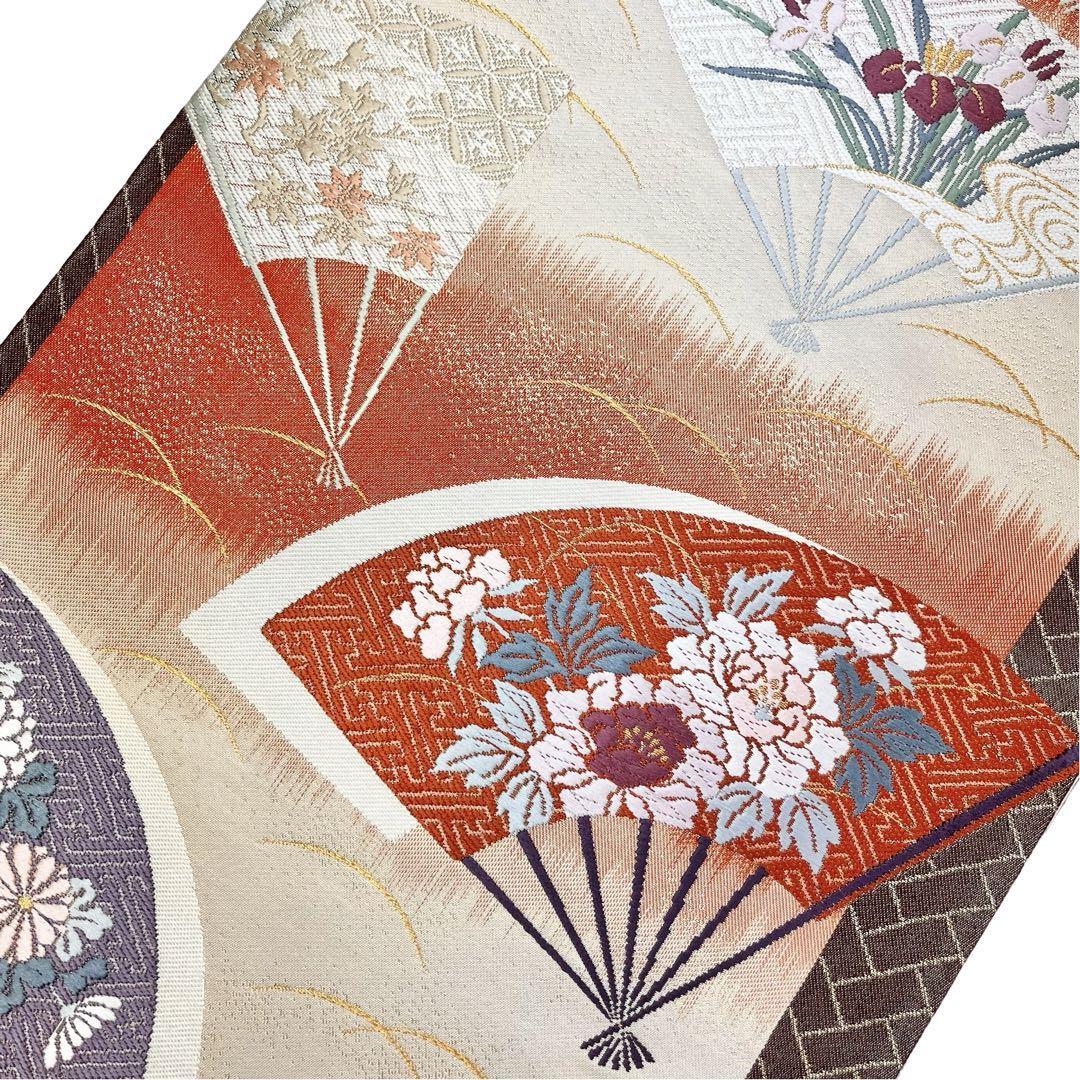 紅柿色と金色の横段グラデーション、扇子に美しい四季の花模様、檜垣に芝紋の柄行がデザインされた素敵なお品でございます。