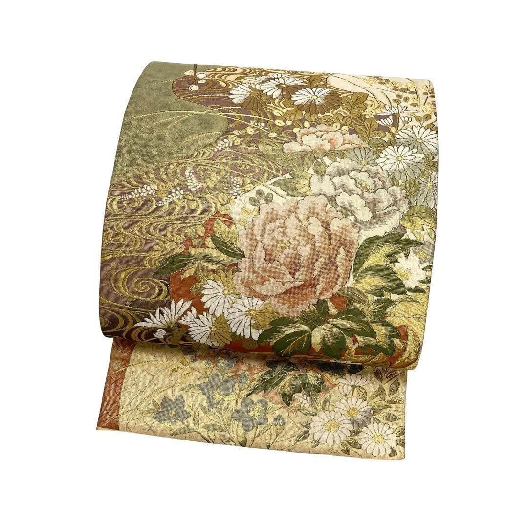 金色ベースのお色、表面両側にそれぞれ辻が花に鳥模様、反対は流水に牡丹、菊などの季節の美しい花模様がデザインされた二面お使い頂ける素敵なお品でございます。