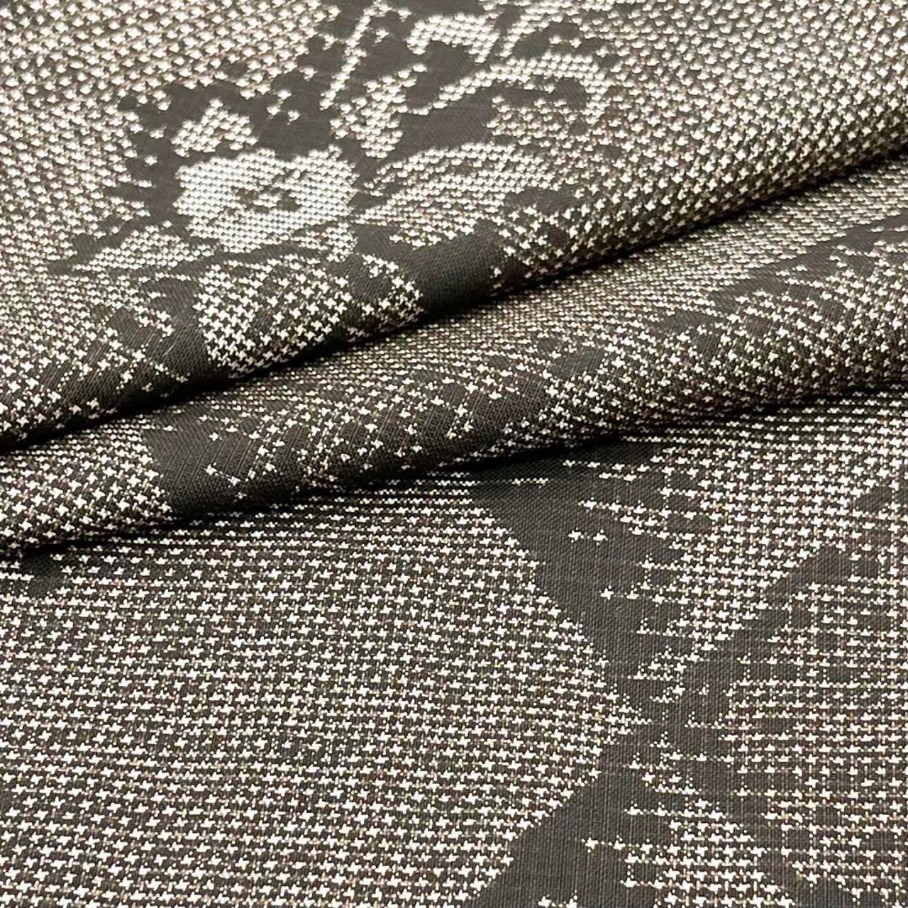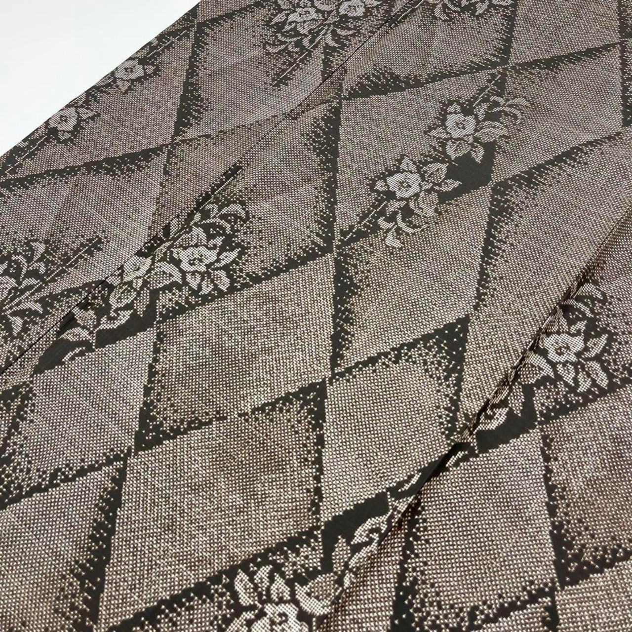 風合いの良い茶泥染、縦柄菱模様に花柄がデザインされた素敵な柄裄のお品でございます。