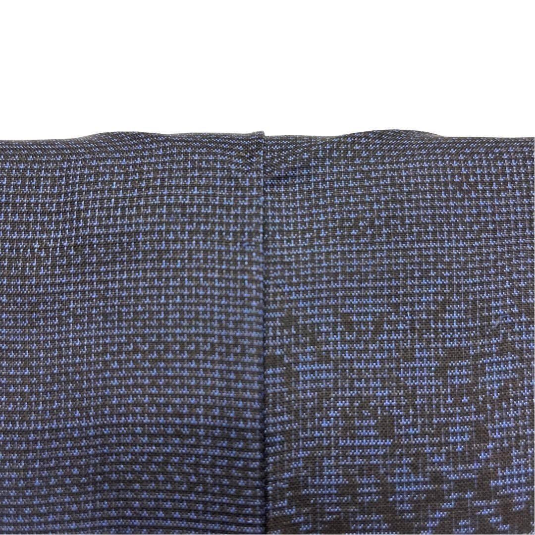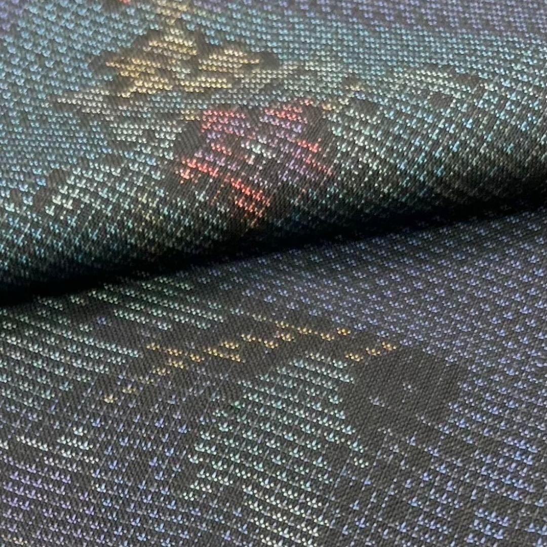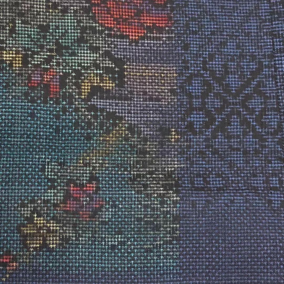 藍泥染の雰囲気の良いお色に四角に牡丹、花草模様がデザインされた素敵な柄行のお品でございます。