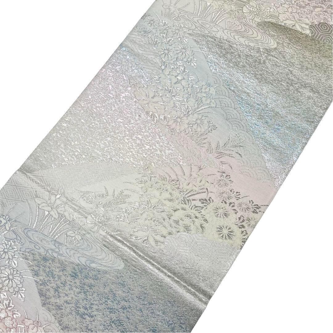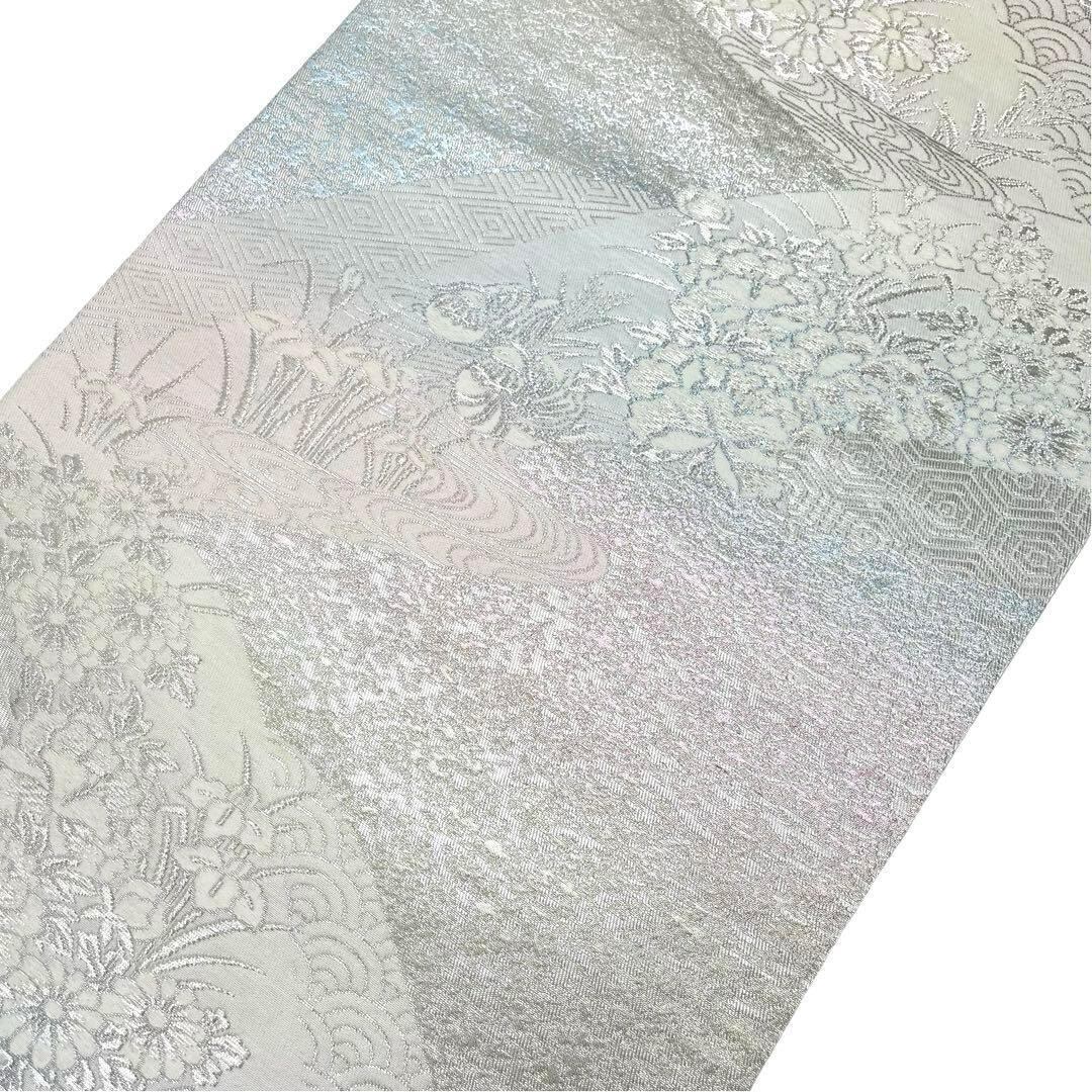 金銀糸が使われた優しいお色味に牡丹、菊、花菖蒲などの上品な花模様がデザインされた素敵な柄裄のお品でございます。