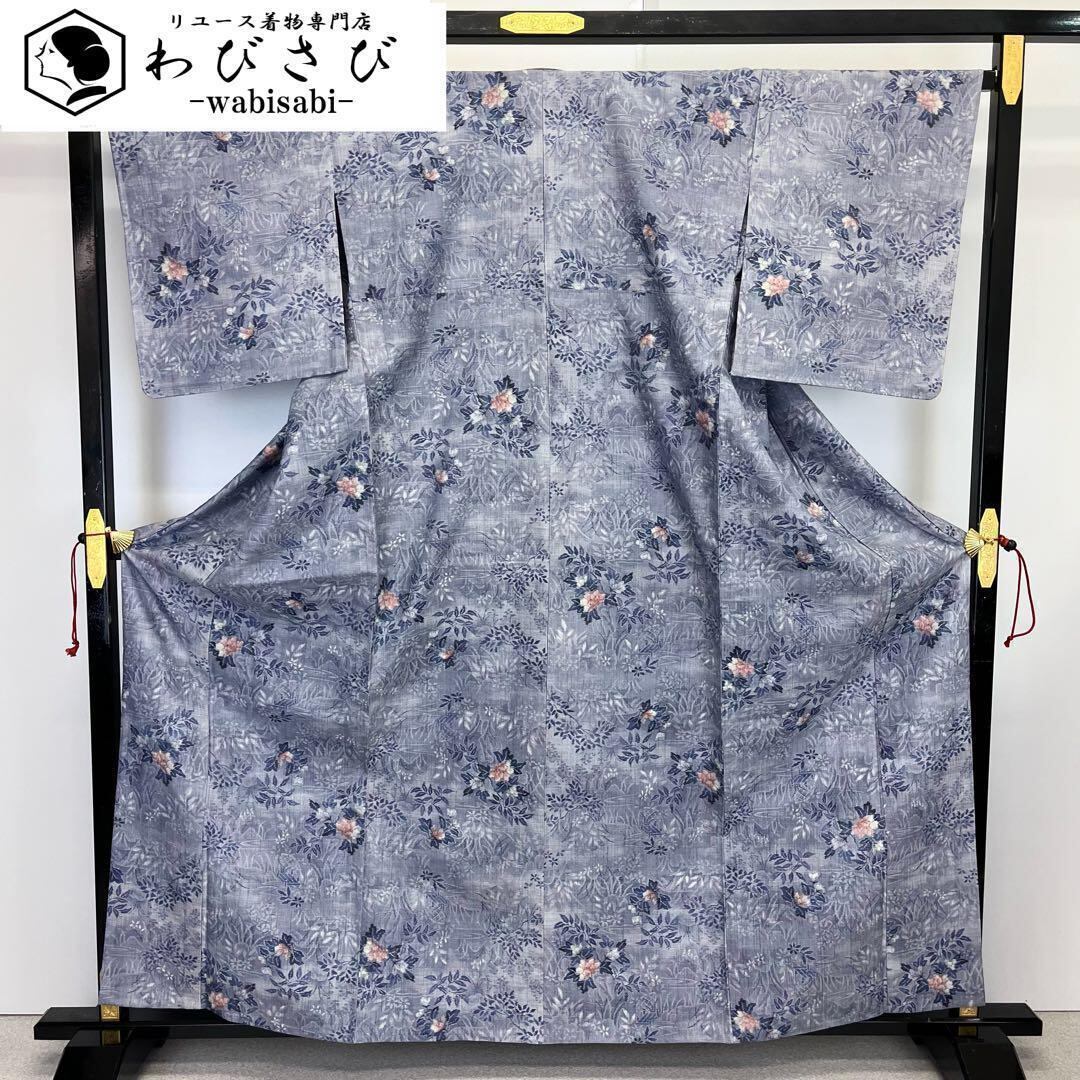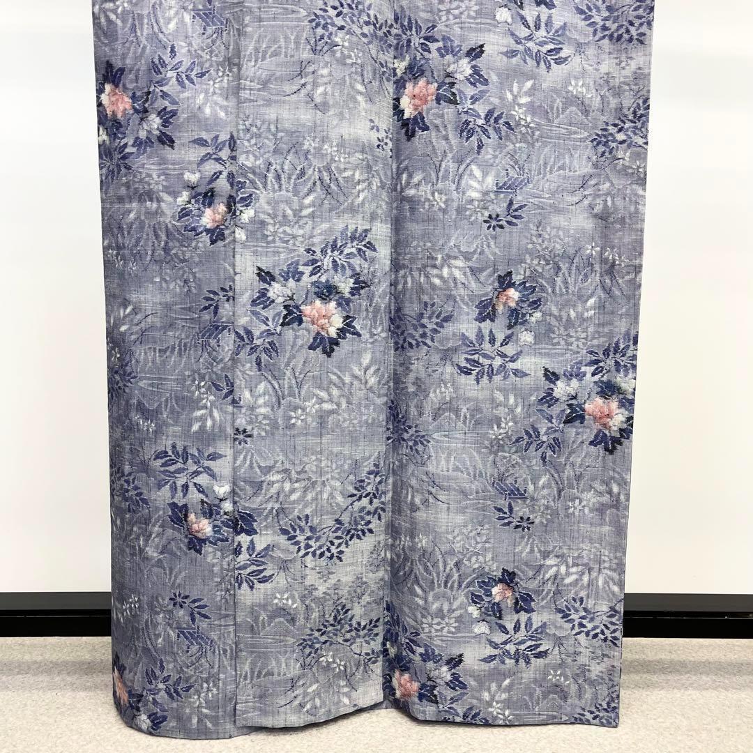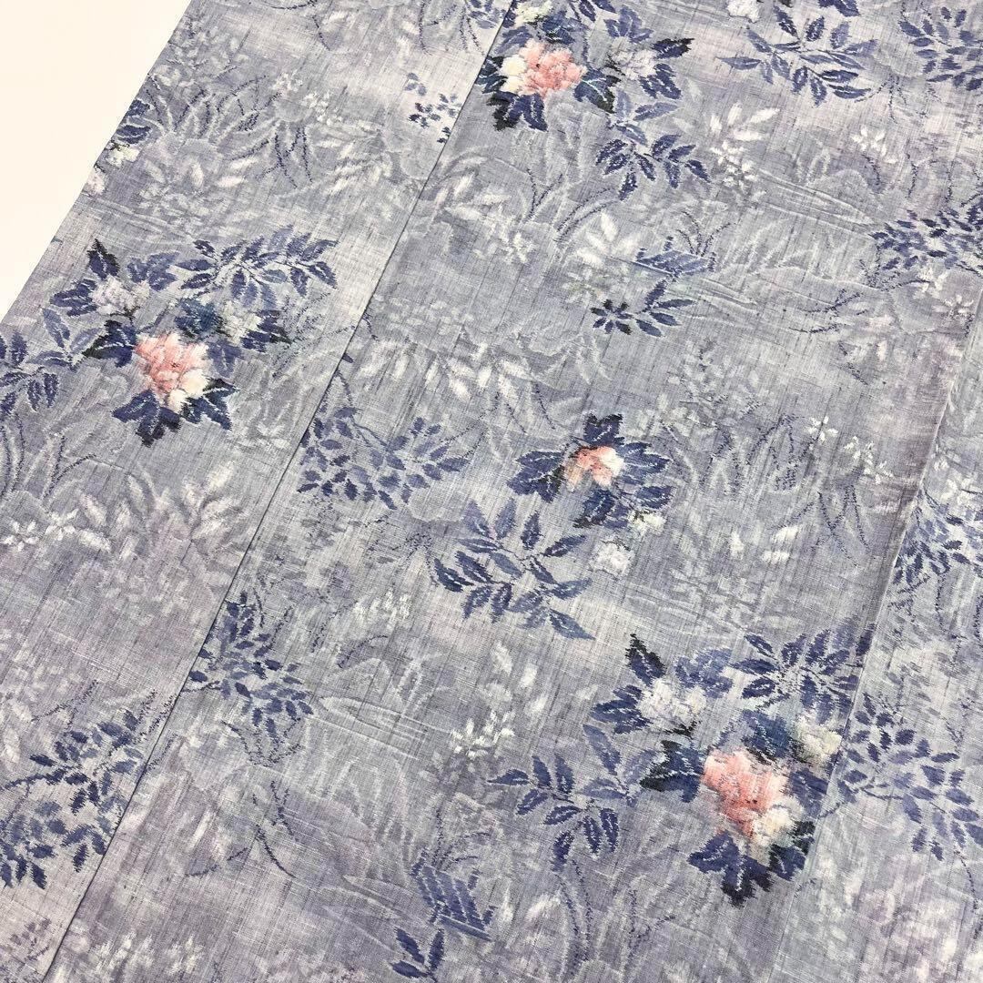 薄藍色の品のあるお色の手触りの良い紬、花柄模様がデザインされた素敵な柄裄のお品でございます。