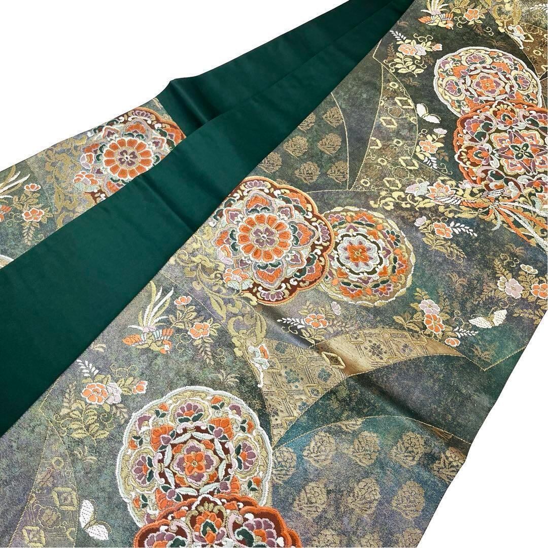 地紙唐尊華丸と題された黒木賊色のお色に美しい華柄模様、鳳凰などがデザインされた煌びやかで素敵な柄裄のお品でございます。