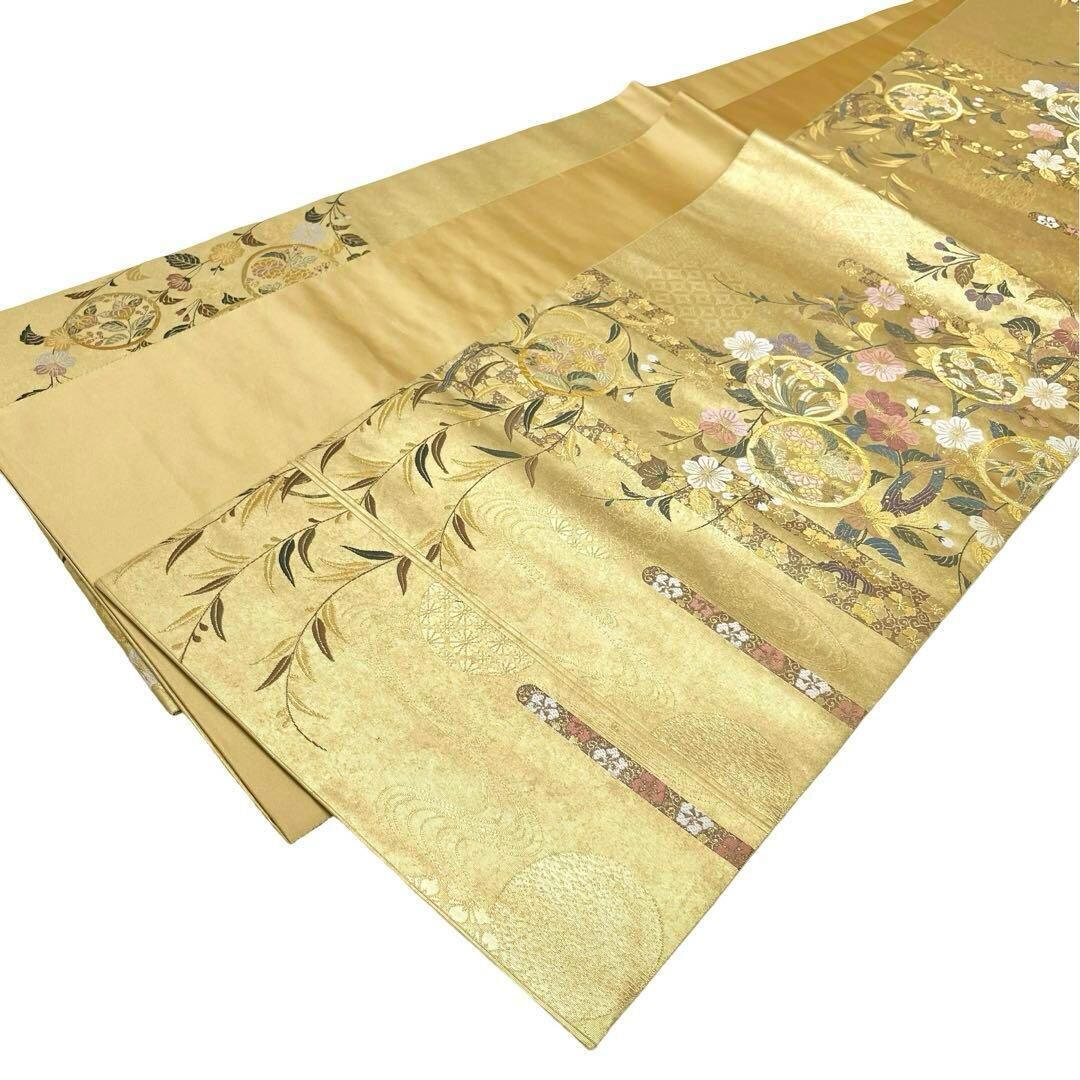 袋帯 美しい花柄 流水模様 七宝繋ぎ 金色 O-3825