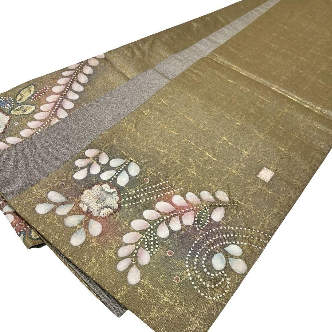 路考茶色ベースに金糸が使われたお色味、金色の格子柄に美しい辻が花模様がデザインされた素敵な柄裄のお品でございます。