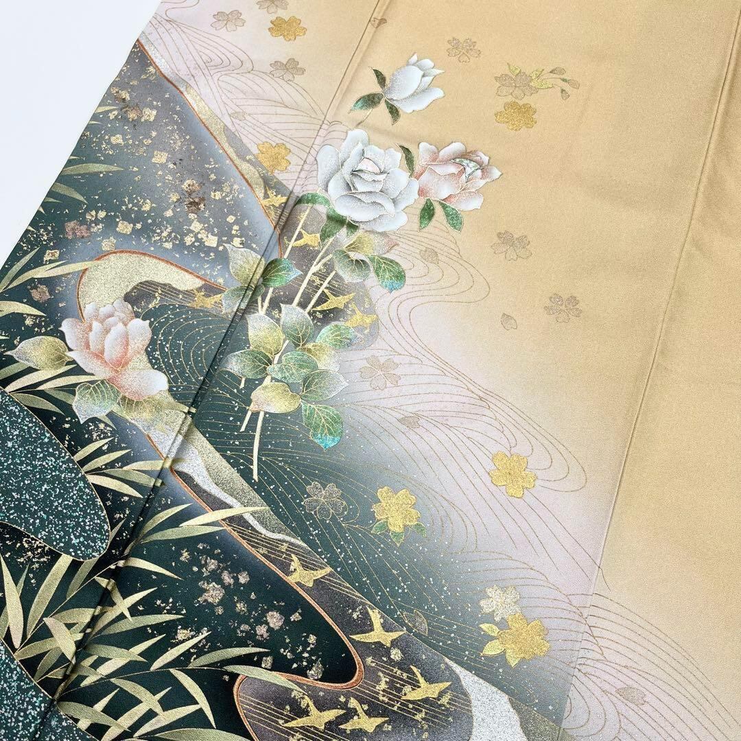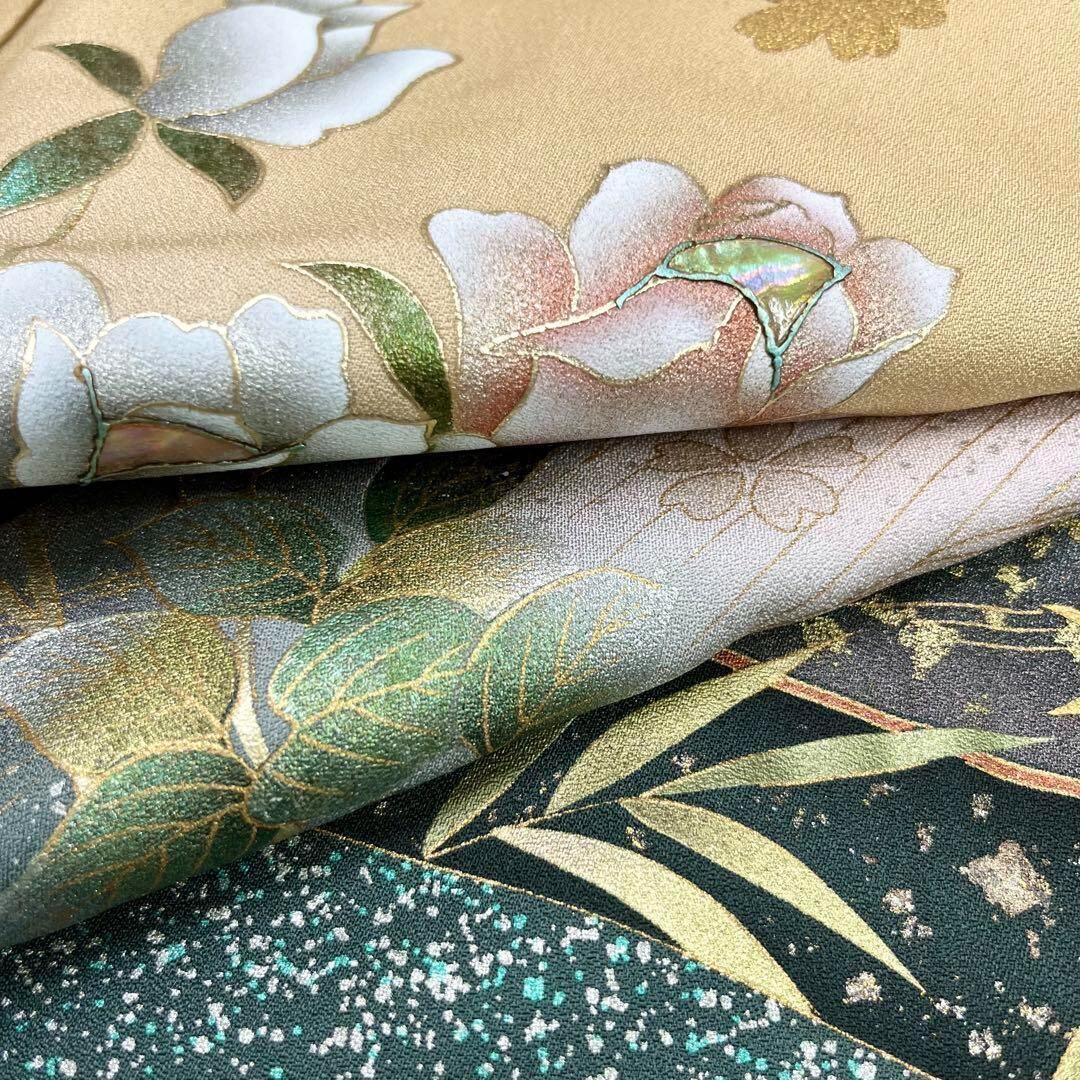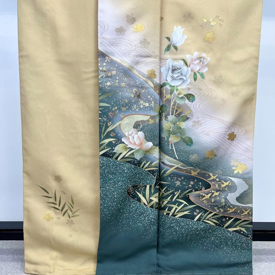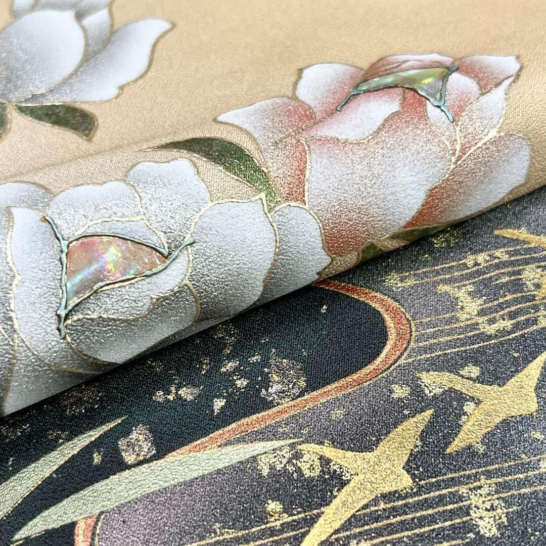 万葉の心と題された上品なお色の草木染、金彩、螺鈿が使われた美しい薔薇と桜の花模様がデザインされた素敵な柄裄のお品でございます。