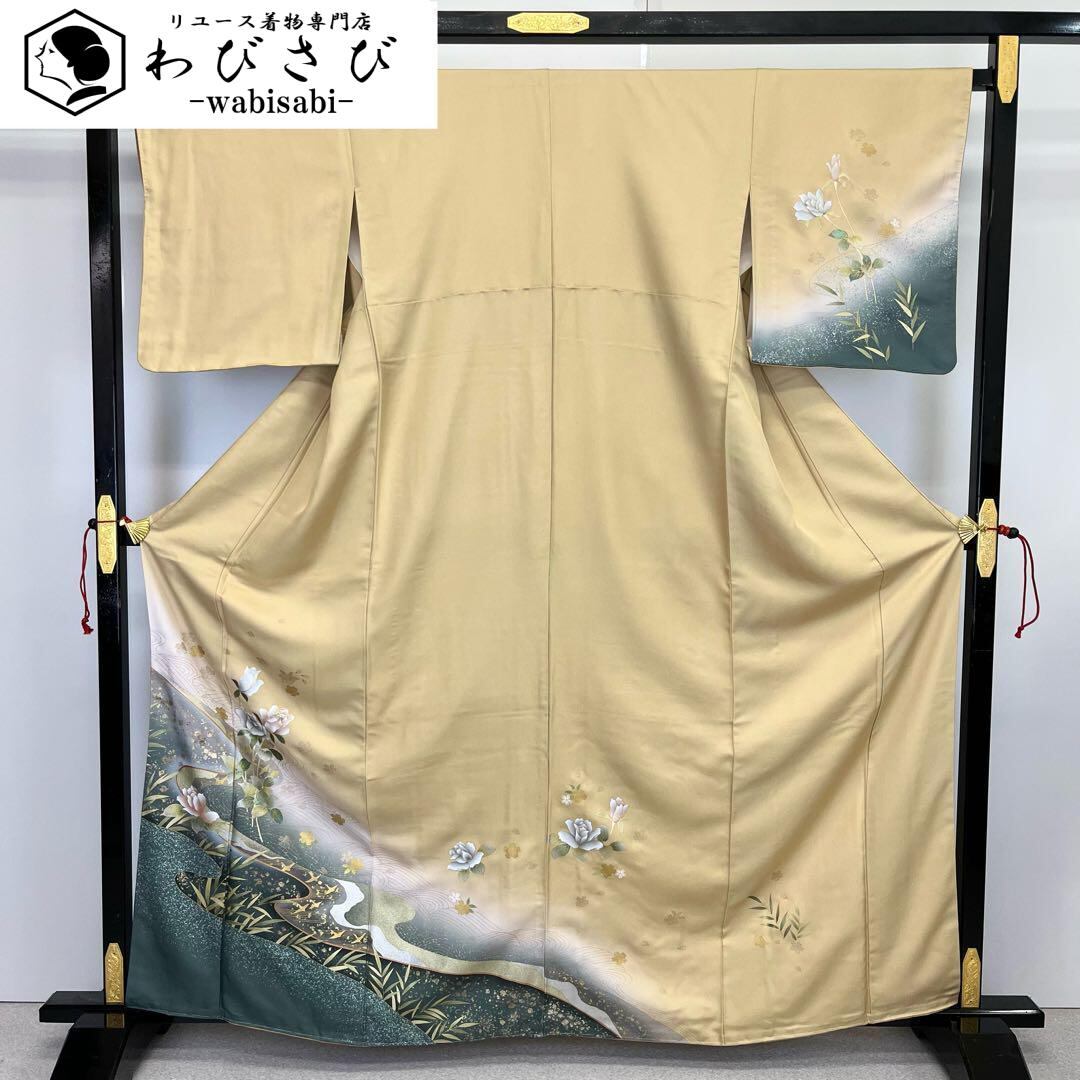 付下げ 薔薇と桜の花模様 流水 螺鈿 丹後縮緬 金銀彩 草木染 K-3775 着物 きもの kimono 和服 和装 中古 リサイクル着物 【送料無料】