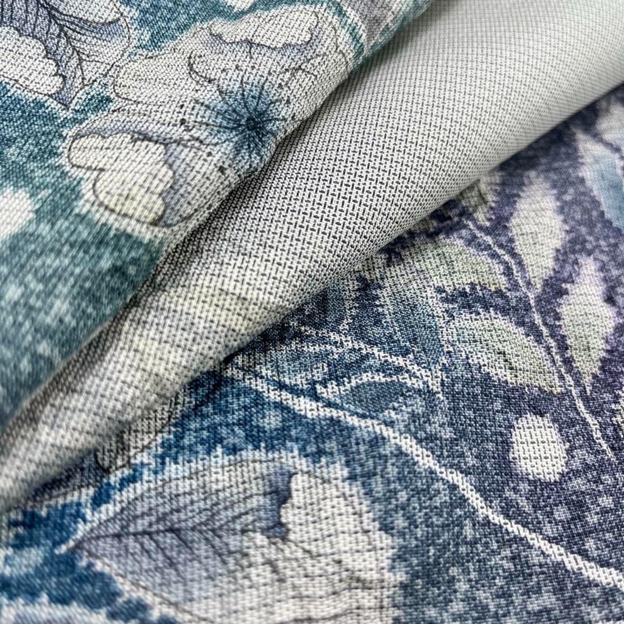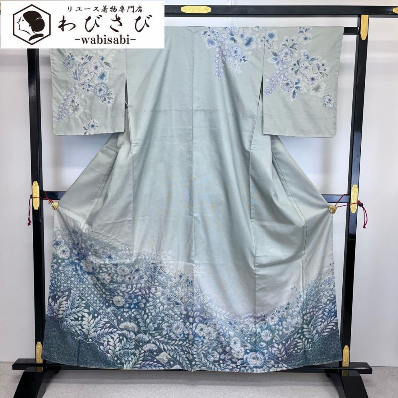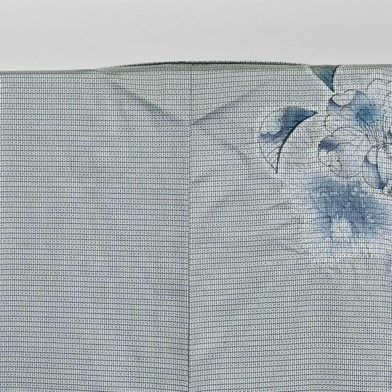 夢織辻が花と題された薄錆青磁色ベースの染大島、上品で美しい色彩の辻が花がデザインされた素敵な柄裄のお品でございます。