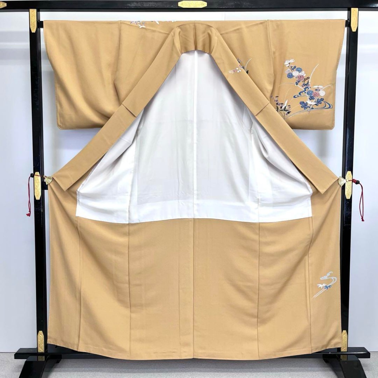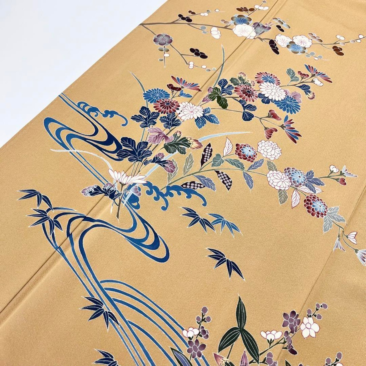 狐色の品のあるお色味に流水に花柄模様の鮮やかな友禅でデザインされた素敵なお品でございます。