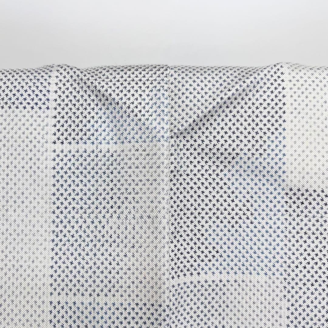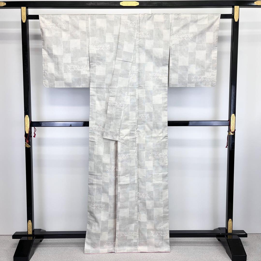 乳白色の上品なお色味に四角に抽象柄がデザインされた素敵な柄裄のお品でございます。
