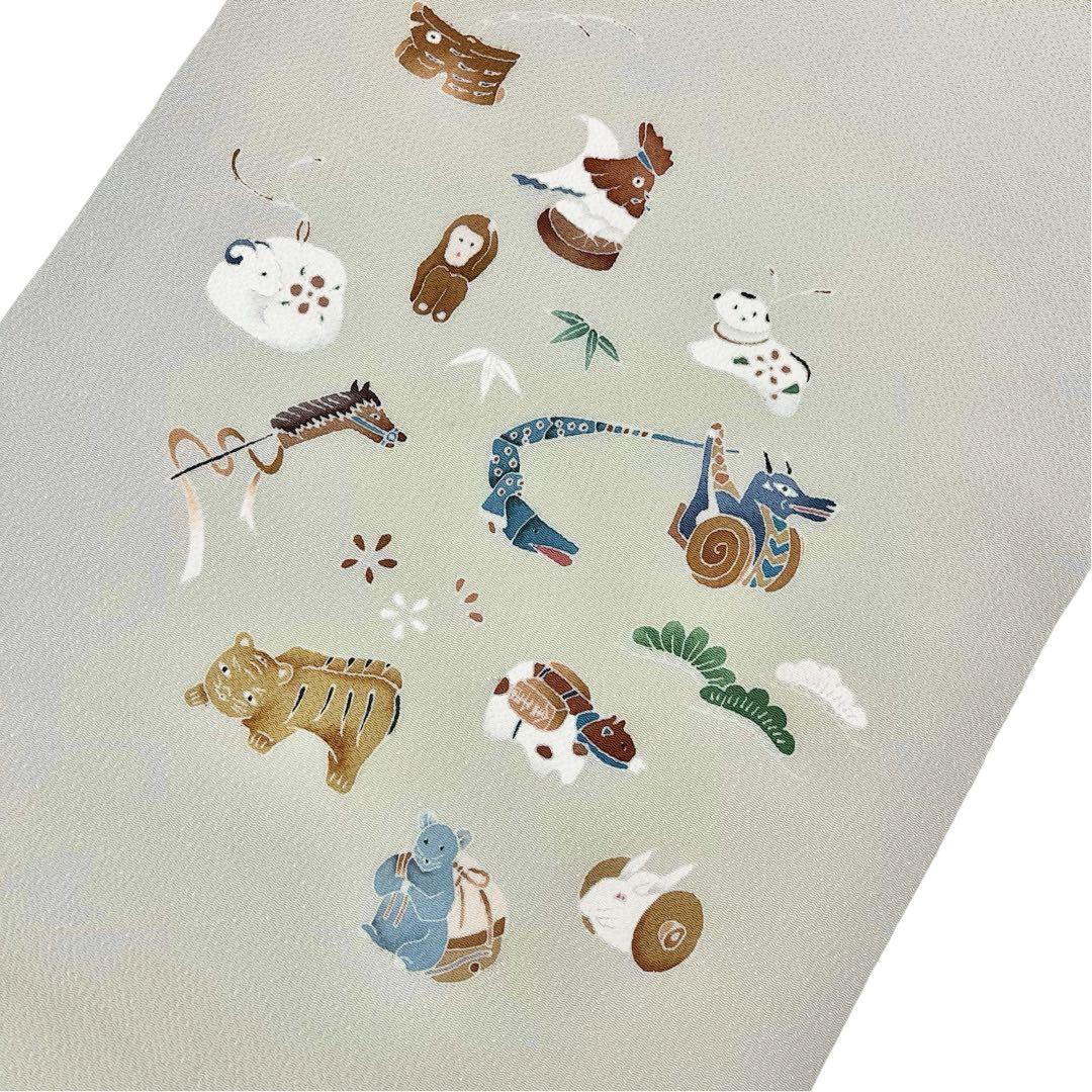 薄裏柳色の上品なお色味の縮緬に可愛らしい玩具の十二支の柄裄がデザインされた素敵なお品でございます。