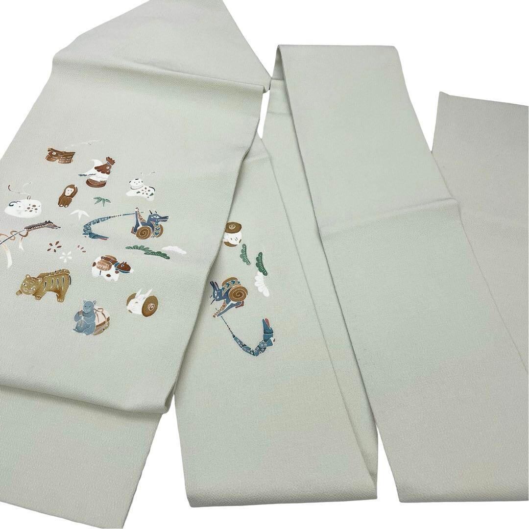 名古屋帯 十二支 可愛らしい干支柄 縮緬 薄裏柳色 O-3839