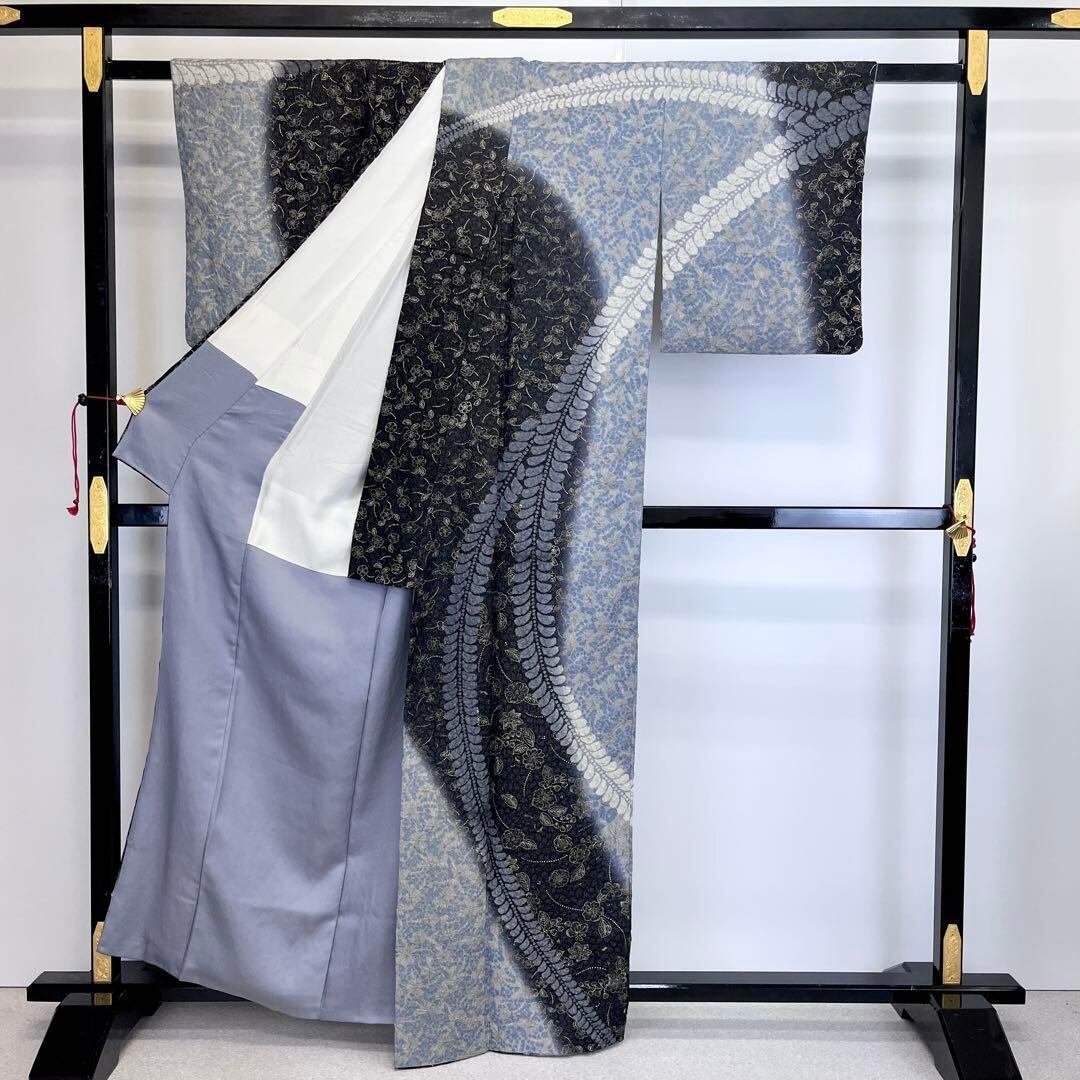落ち着きのある青系の2色のグラデーションに金通し、絞り、金糸が使われた豪華な辻が花模様の柄裄が美しい素敵なお品でございます。