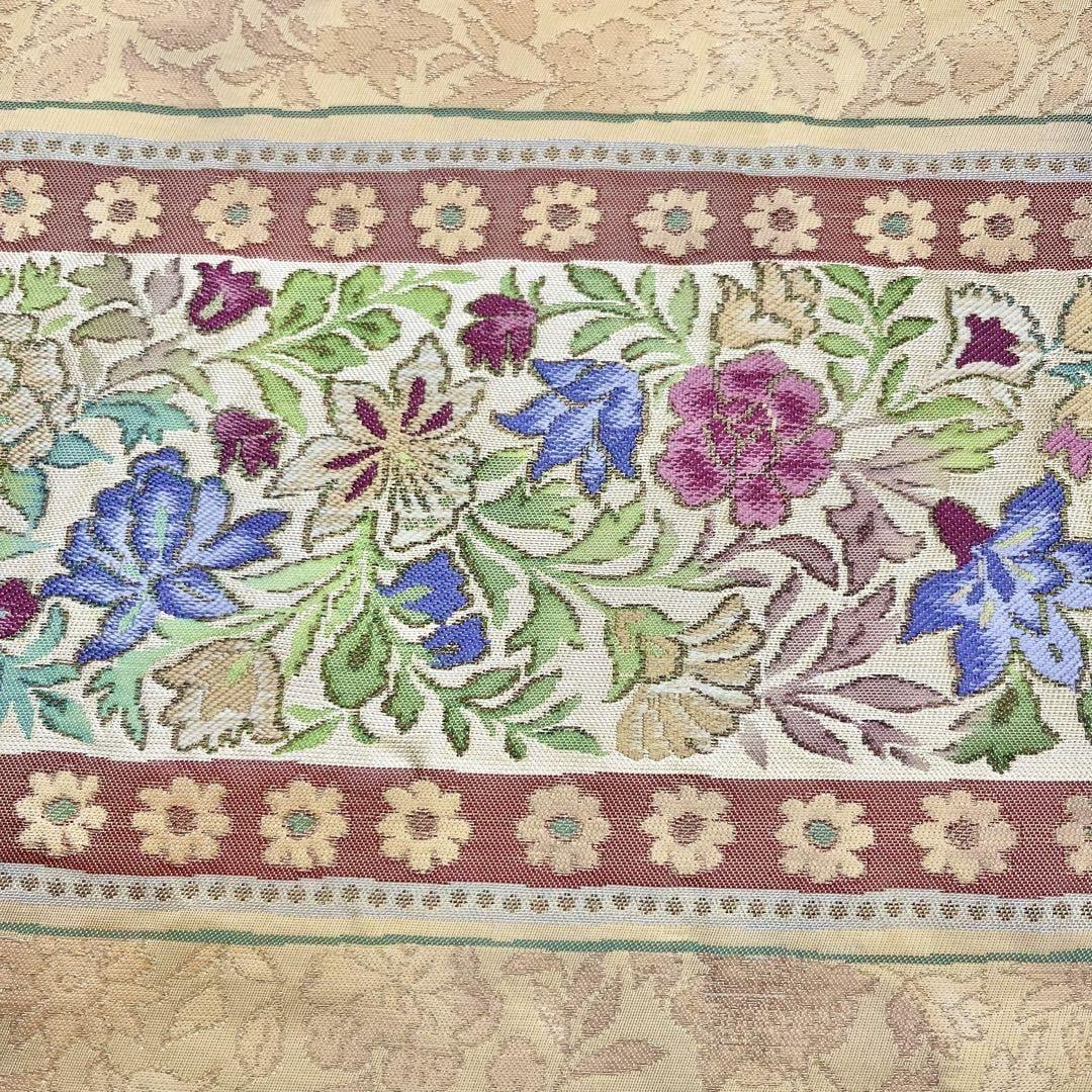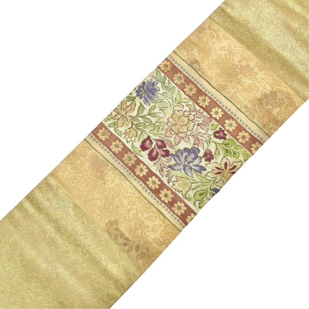 金色ベースのお色に花唐草模様、横段花柄織模様がデザインされた素敵な柄裄のお品でございます。