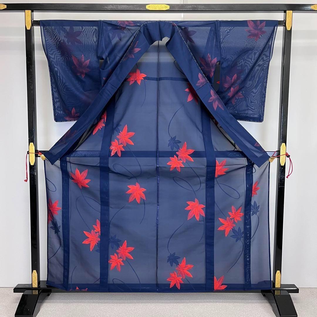 夏着物 紗 小紋 舞い散る紅葉模様 紺色 しつけ糸 K-3821