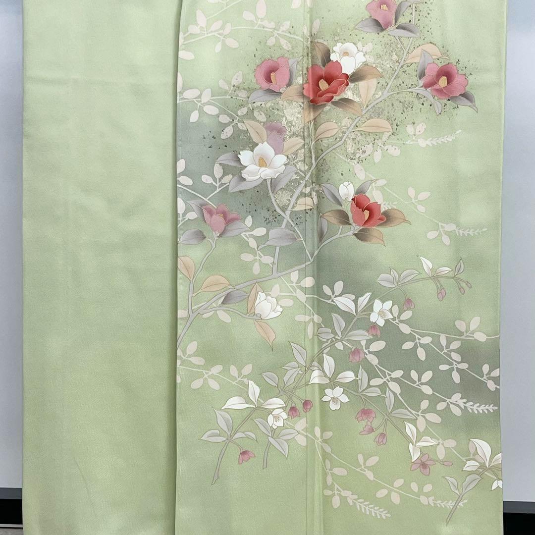 訪問着 上品な花模様 椿に萩 金彩 暈し 薄柳色 しつけ糸 K-3822
