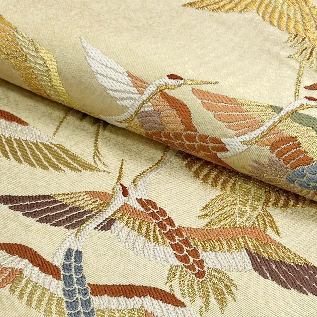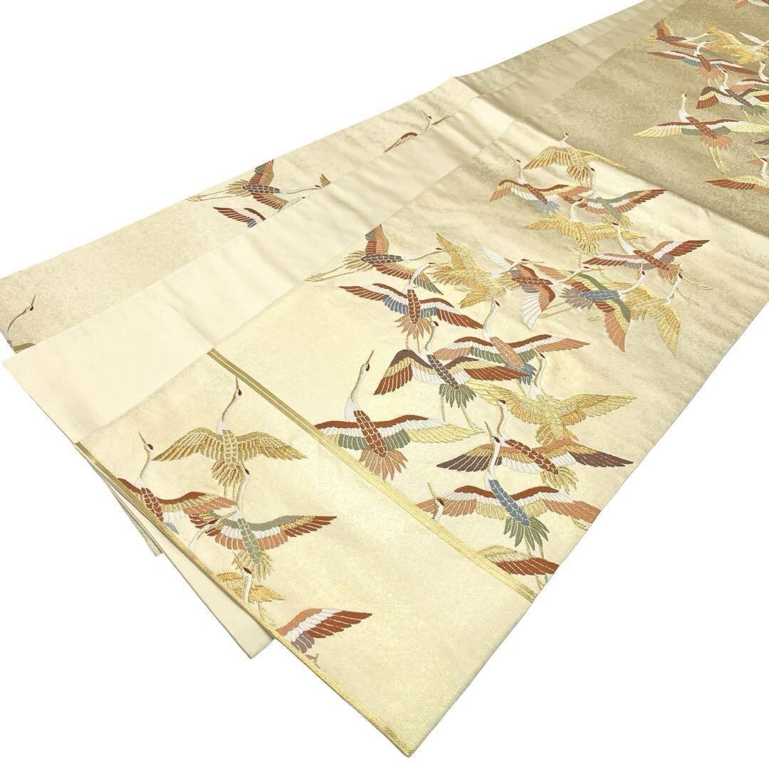 袋帯 彩り鮮やかな美しい飛翔鶴の群れ 金糸 鳥の子色 O-3862 着物 きもの kimono 和服 和装 中古 リサイクル着物 【送料無料】