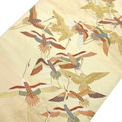鳥の子色の品のあるお色味に金糸が使われた彩り鮮やかな美しい飛翔鶴の群れがデザインされた素敵な柄裄のお品でございます。