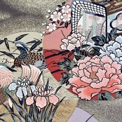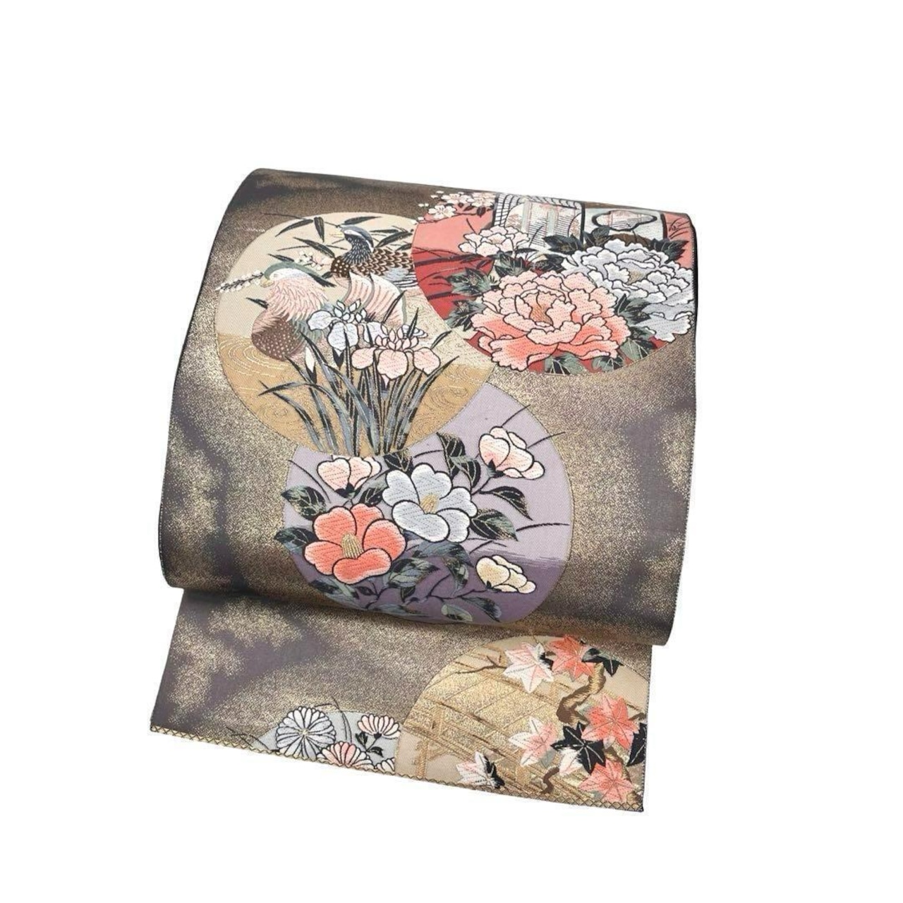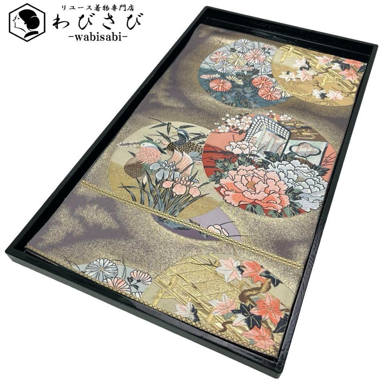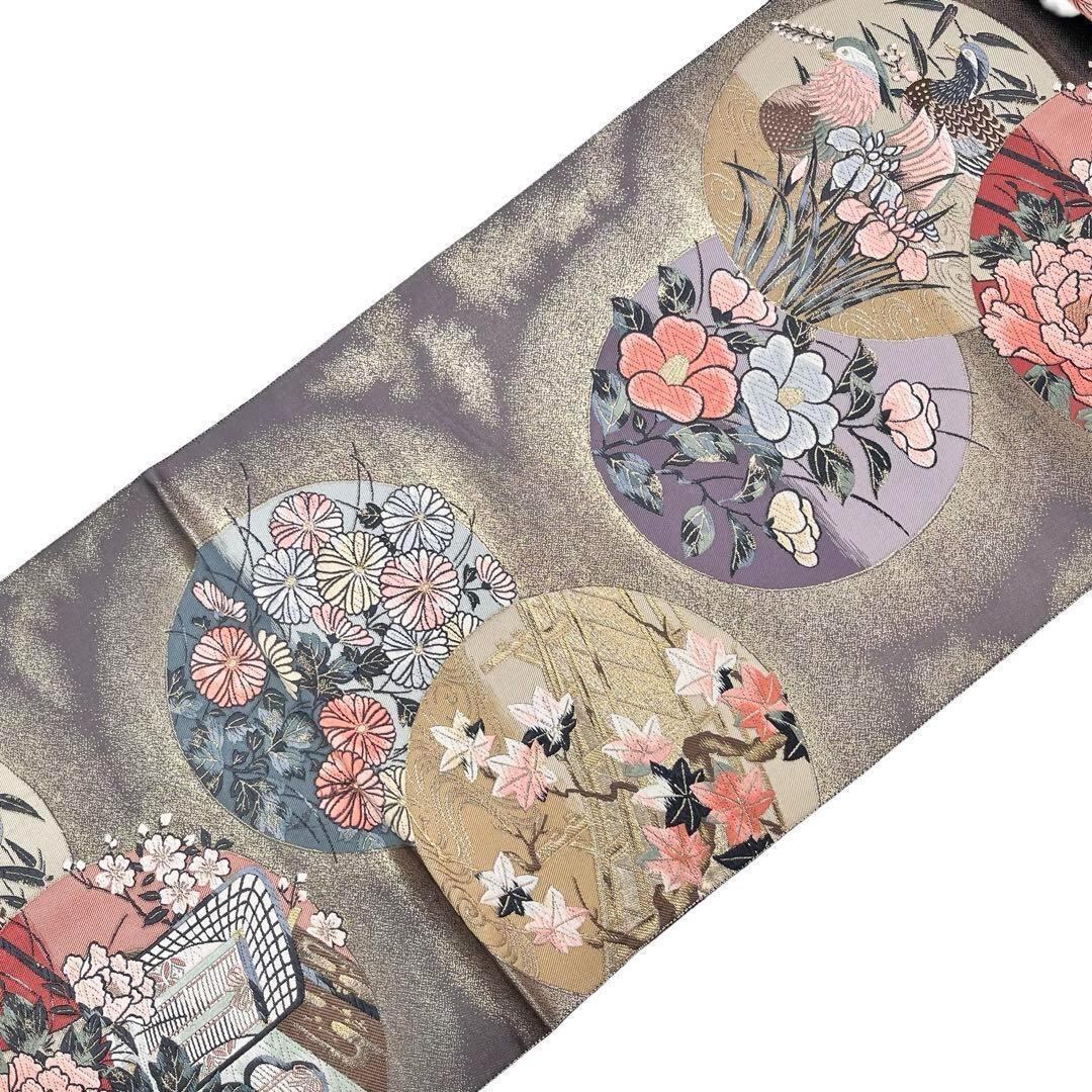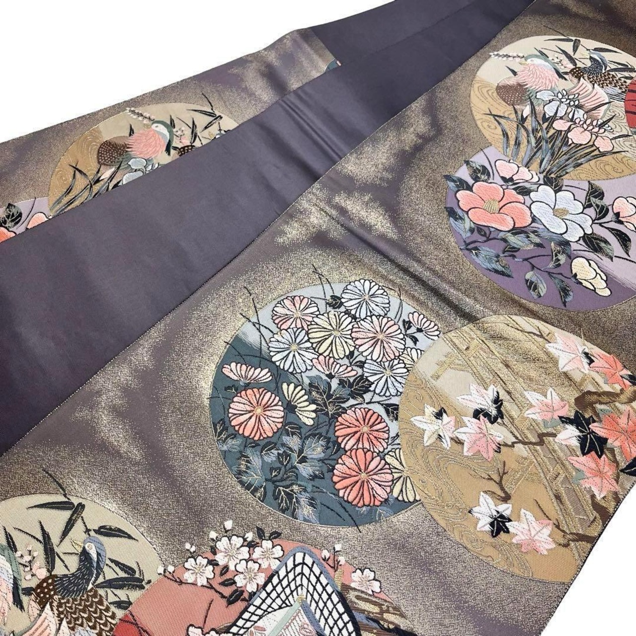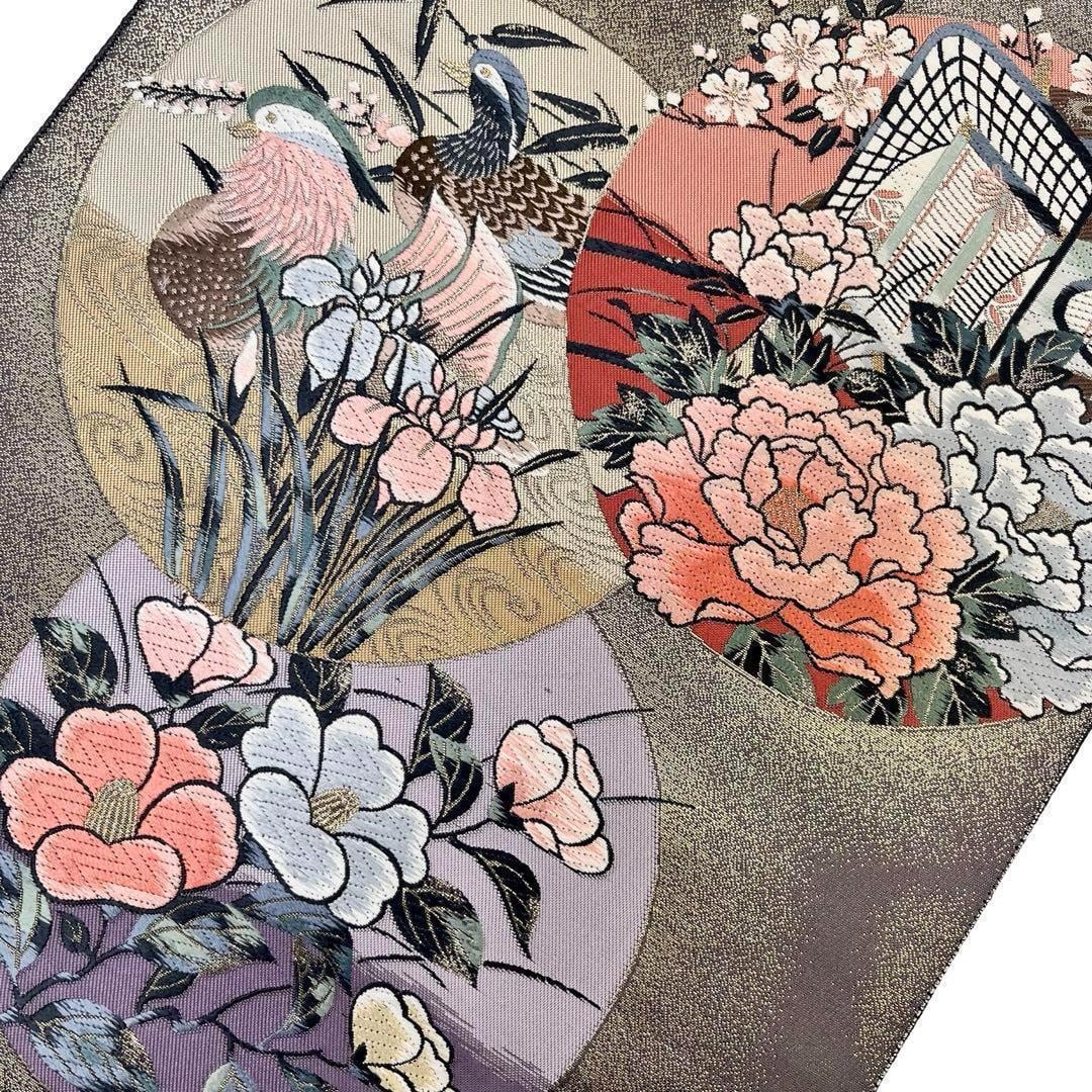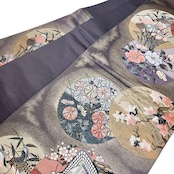 九百錦琳派春秋丸文と題された丸の中に牡丹、椿、花菖蒲の花模様、鴛鴦、御所車などがデザインされた素敵な柄裄のお品でございます。