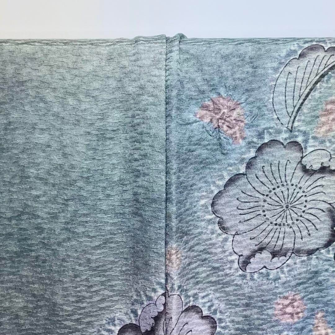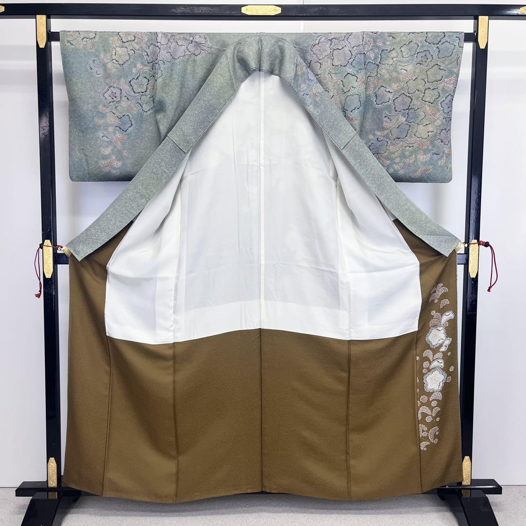 青磁色ベースの落ち着きのあるくすみカラーの美しい暈し染の色彩、柄部分に銀通し、金駒刺繍などでデザインされた辻が花絞りの素敵な柄裄のお品でございます。