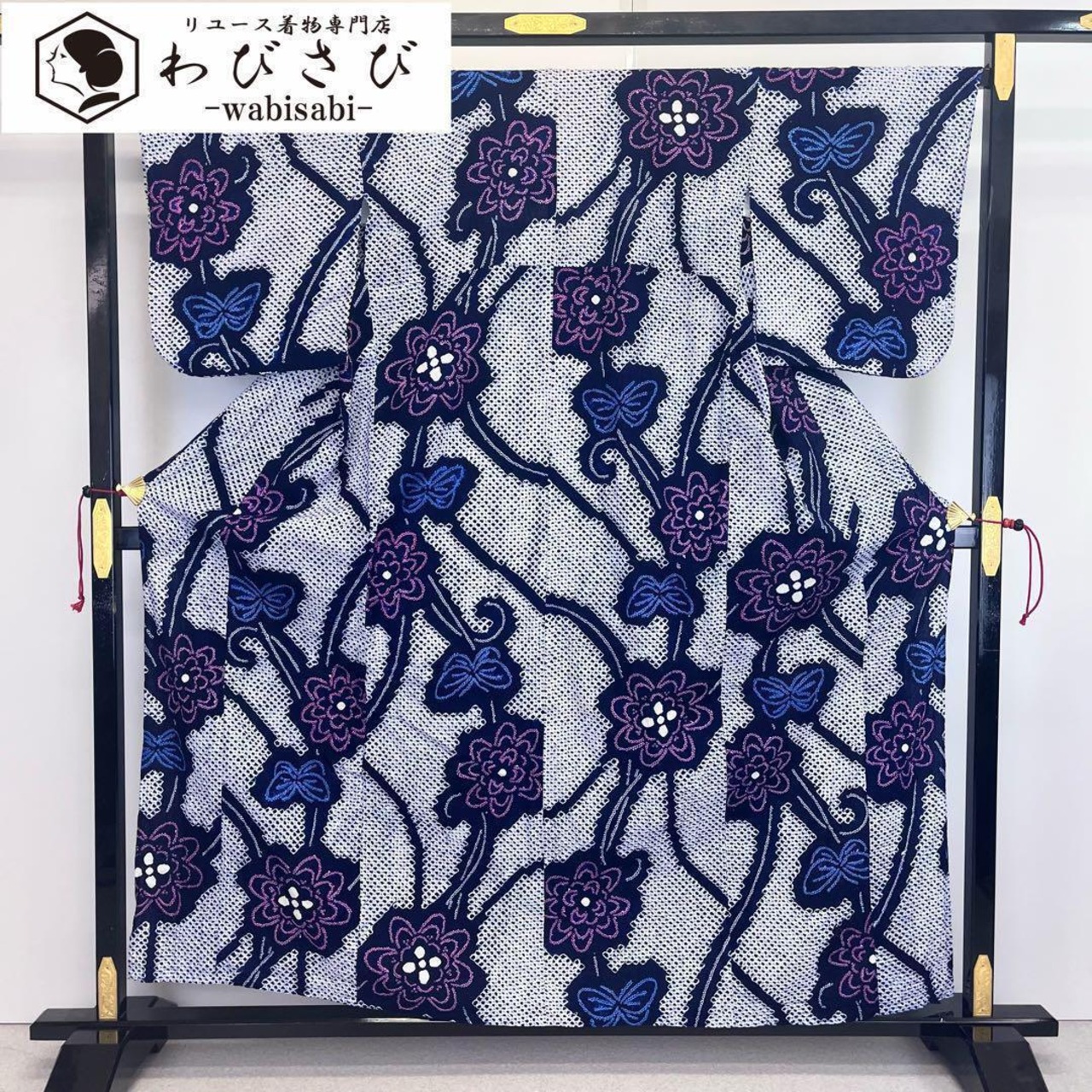 藍色ベースの美しいお色味、蝶々と花模様がデザインされた素敵な柄裄のお品でございます。