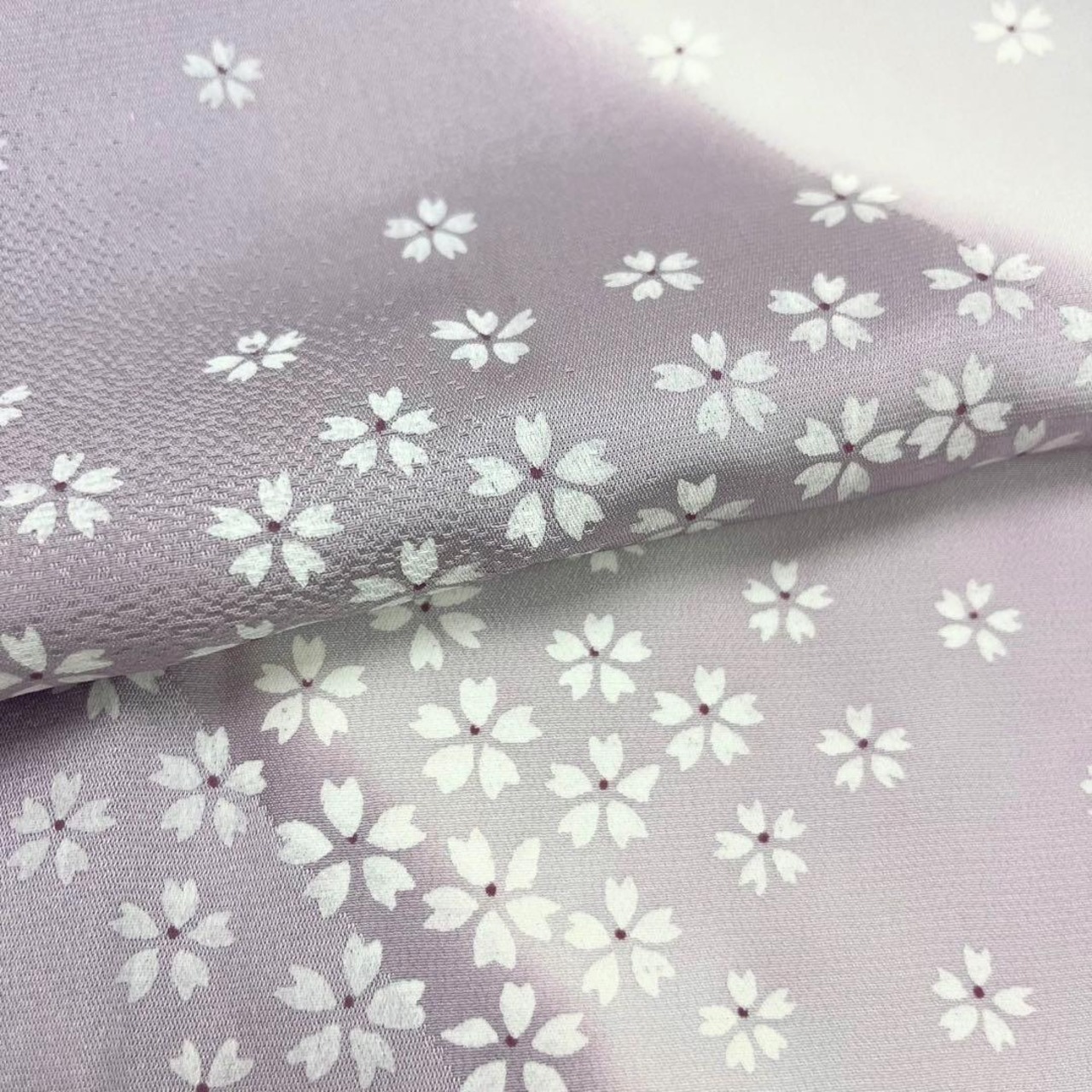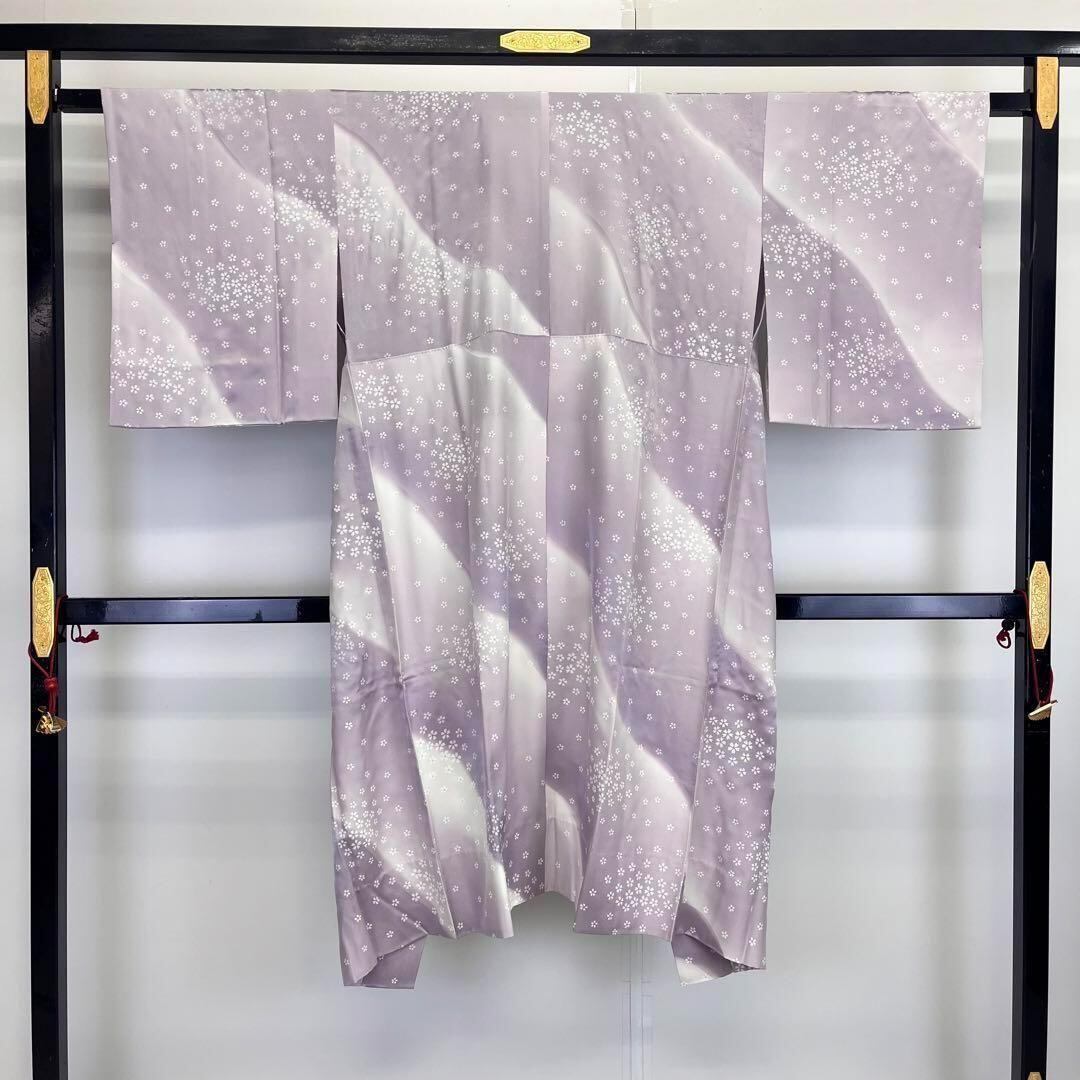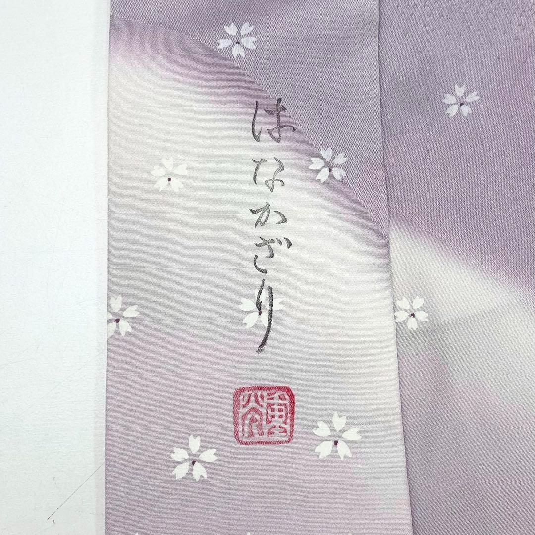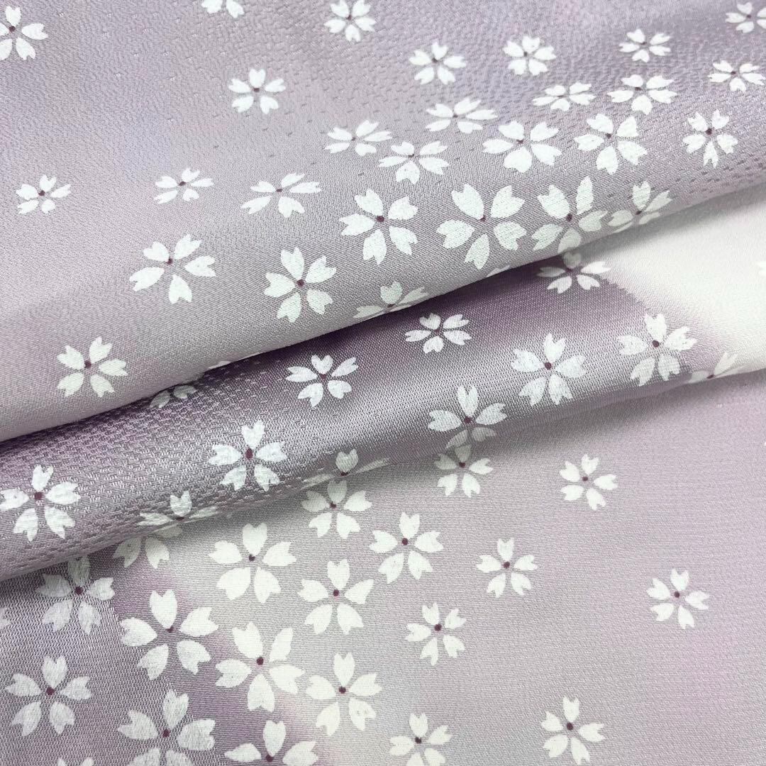 はなかざりと題された淡紫色ベースの暈し染に桜の花模様がデザインされた素敵な柄裄のお品でございます。