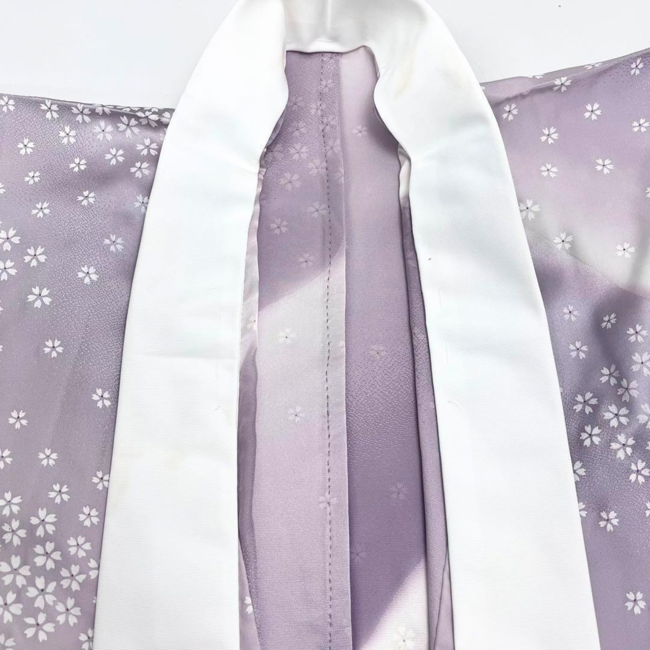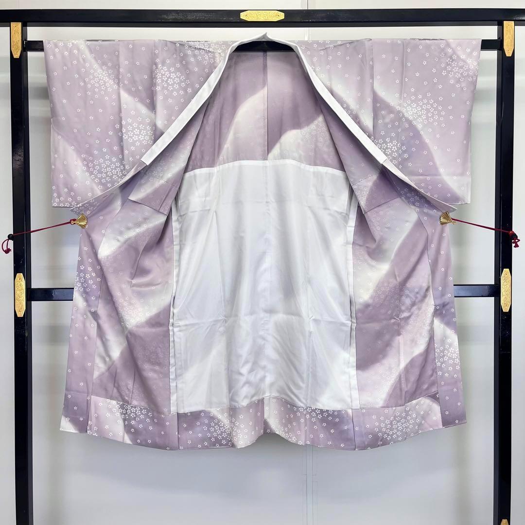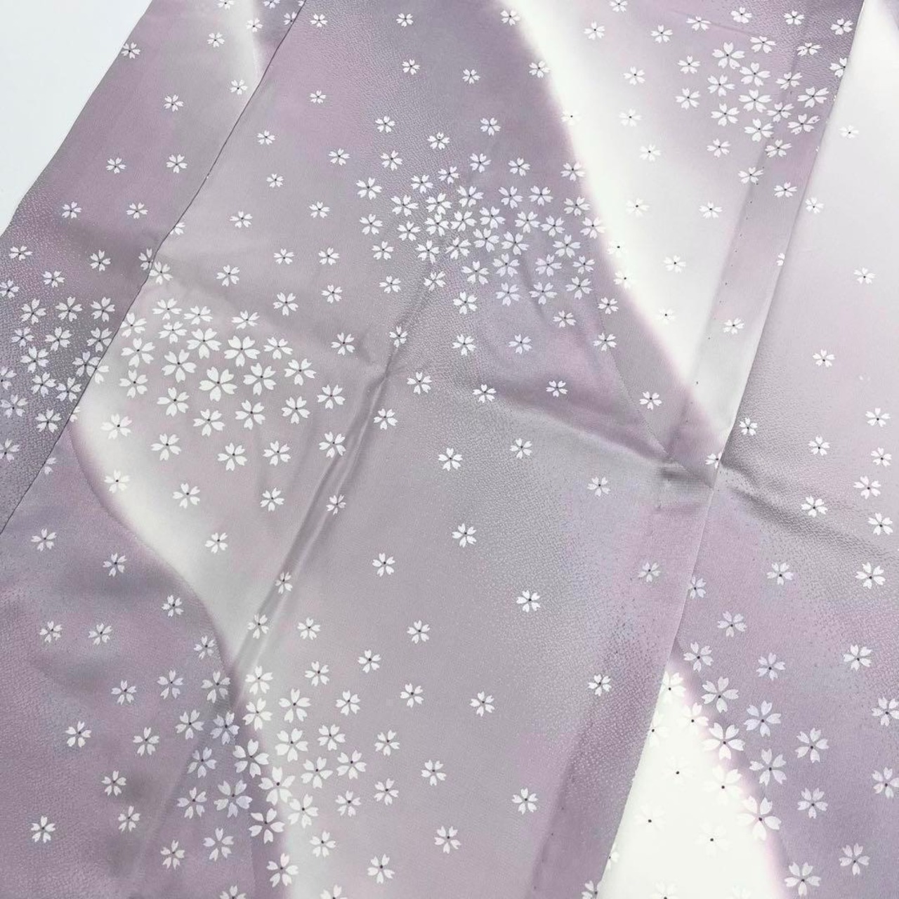 はなかざりと題された淡紫色ベースの暈し染に桜の花模様がデザインされた素敵な柄裄のお品でございます。