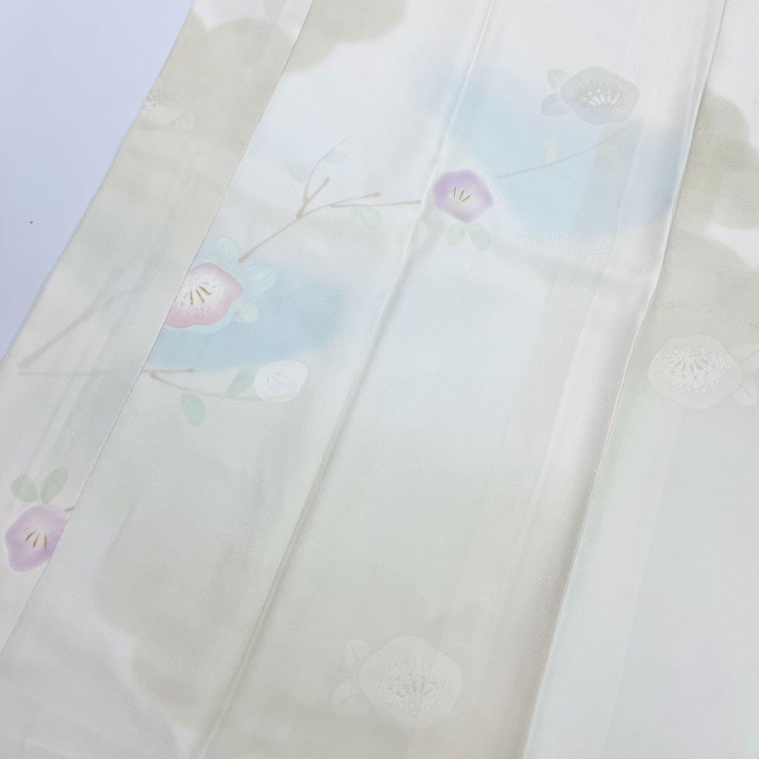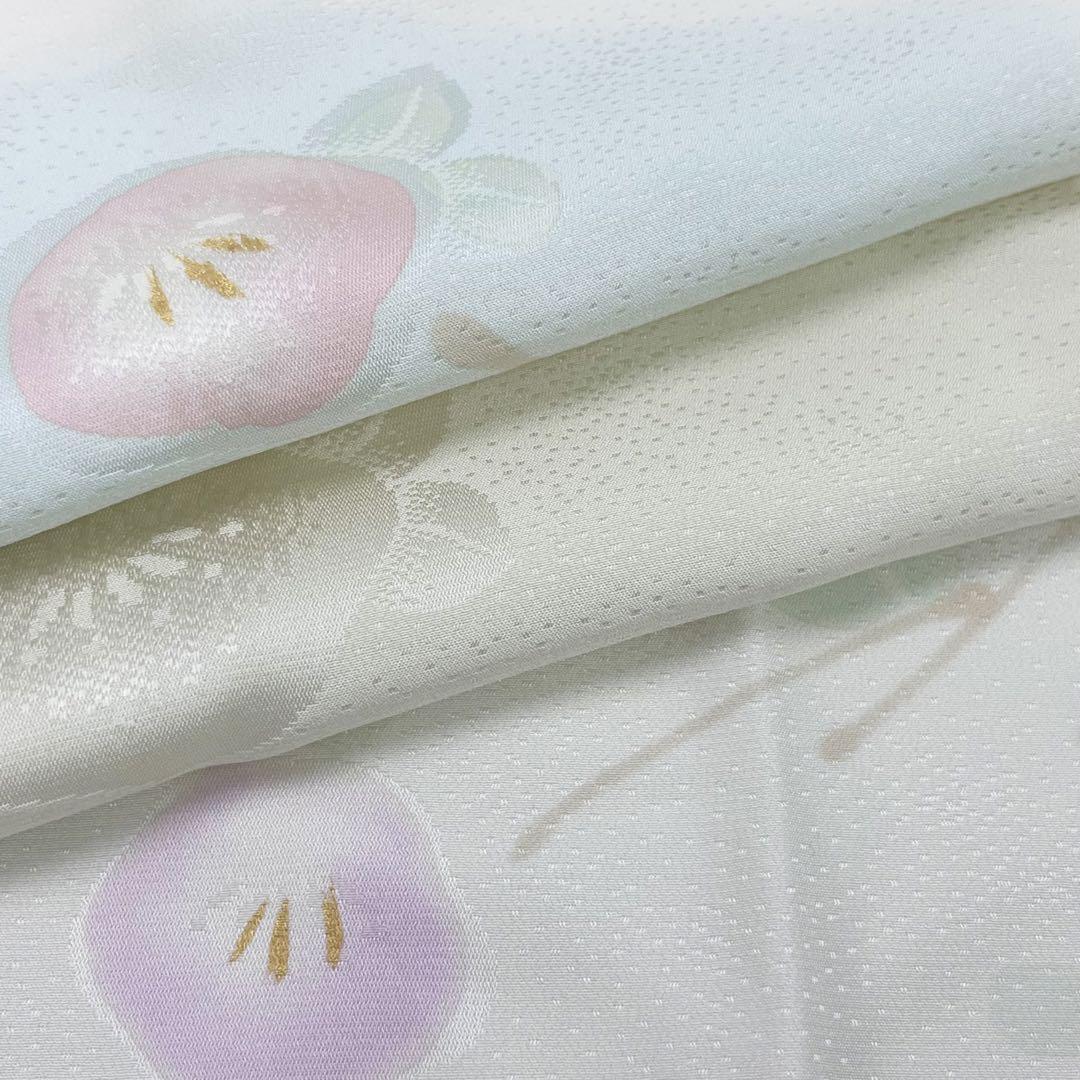 白百合色ベースの品のあるお色味に牡丹草木染、暈し染の淡いお色味の椿の花に雲模様がデザインされた素敵な柄裄のお品でございます。