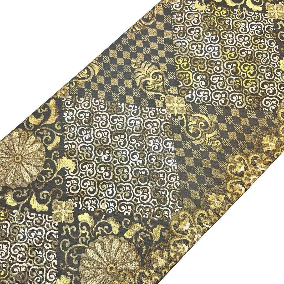 薄黒色のお色味に金糸で煌びやかにデザインされた斜め市松柄に華柄模様の柄裄が素敵なお品でございます。