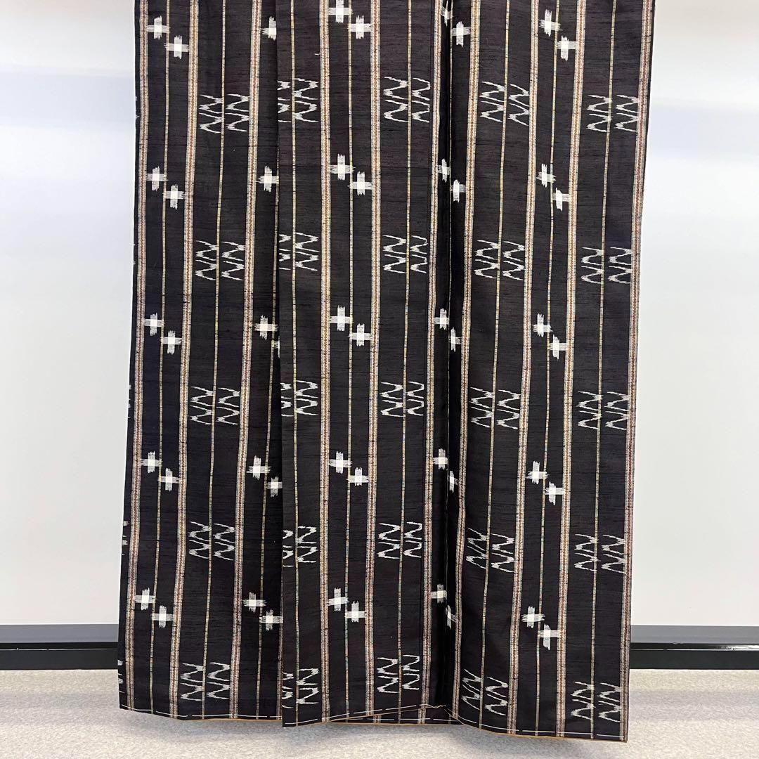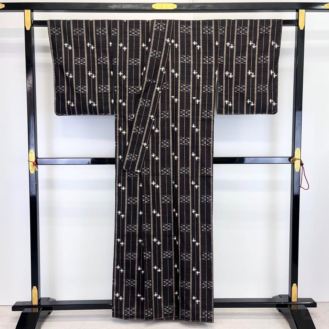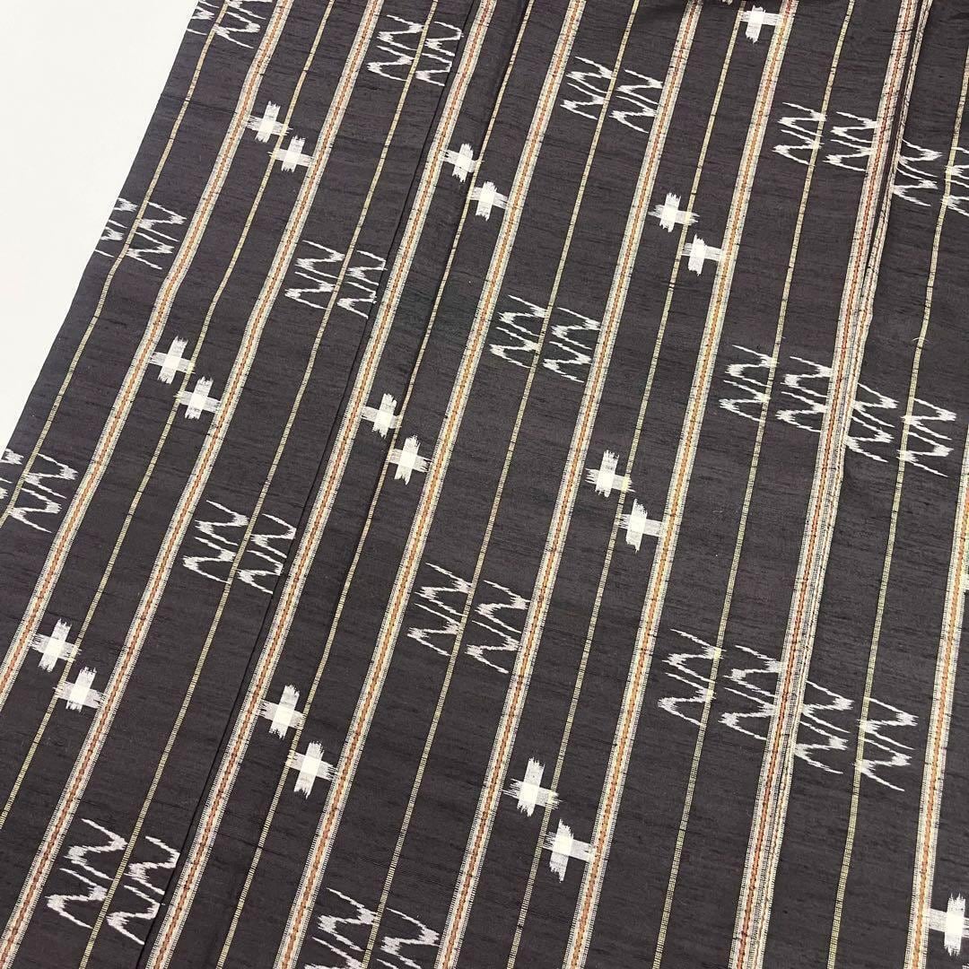 大城廣四郎織物工場、伝統工芸士、大城誠光、琉球本染絣、石板色の味わいのあるお色味、縦縞に琉球模様がデザインされた沖縄の雰囲気を感じられる素敵な柄裄のお品でございます。