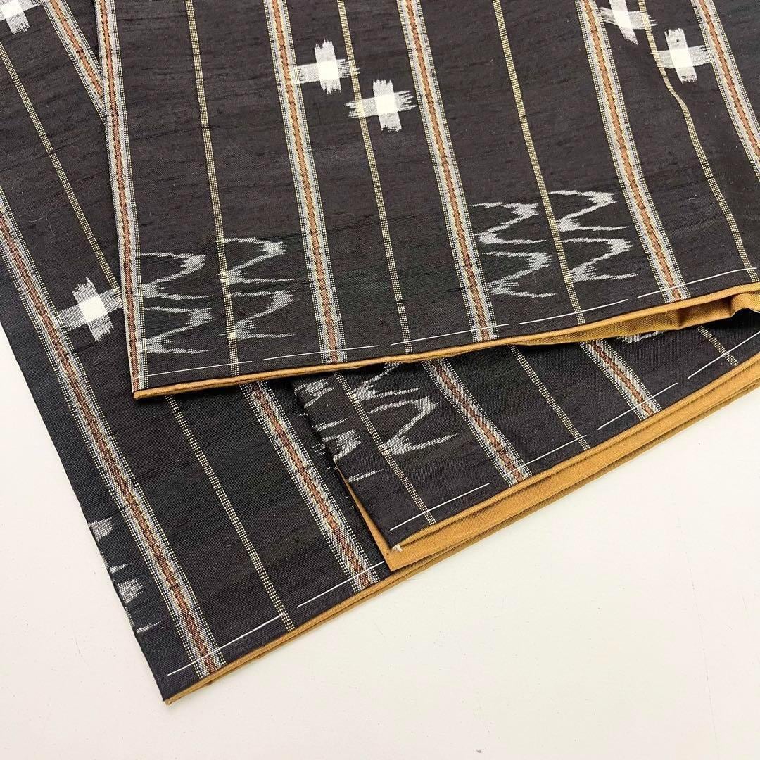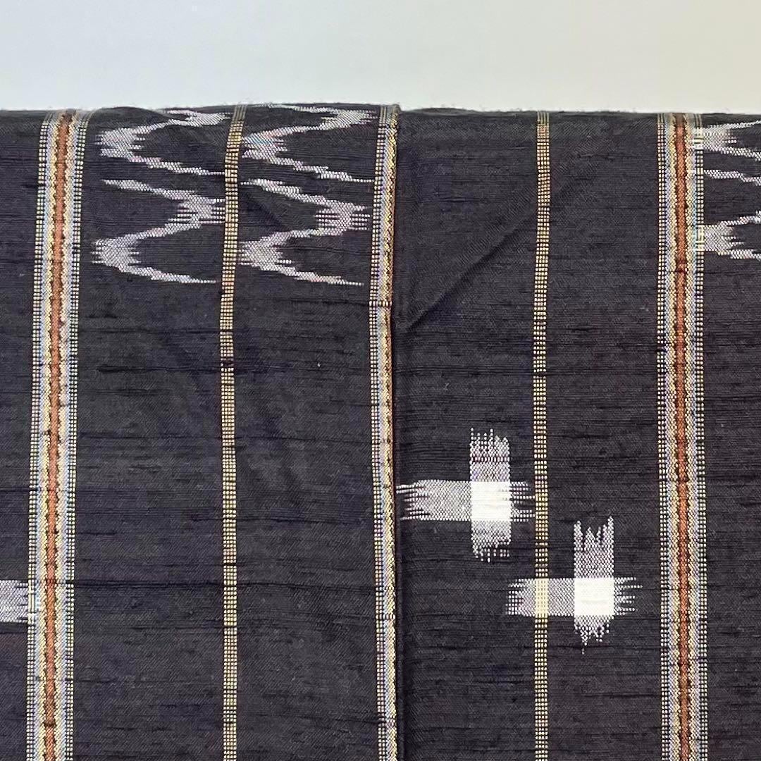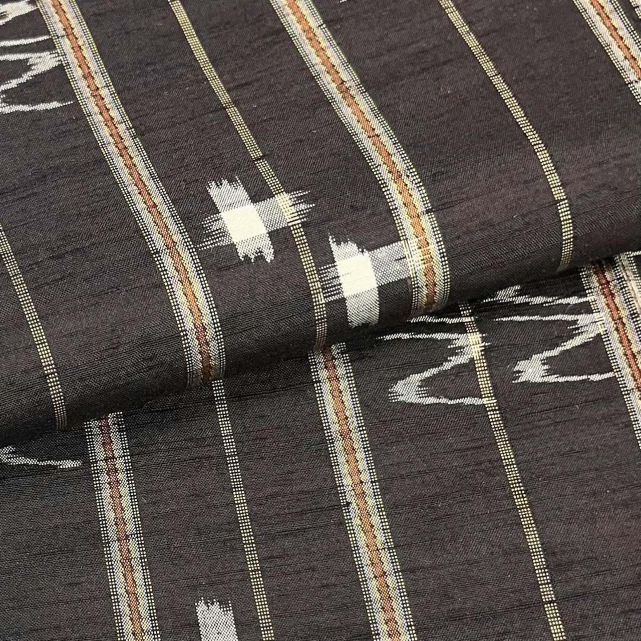 大城廣四郎織物工場、伝統工芸士、大城誠光、琉球本染絣、石板色の味わいのあるお色味、縦縞に琉球模様がデザインされた沖縄の雰囲気を感じられる素敵な柄裄のお品でございます。