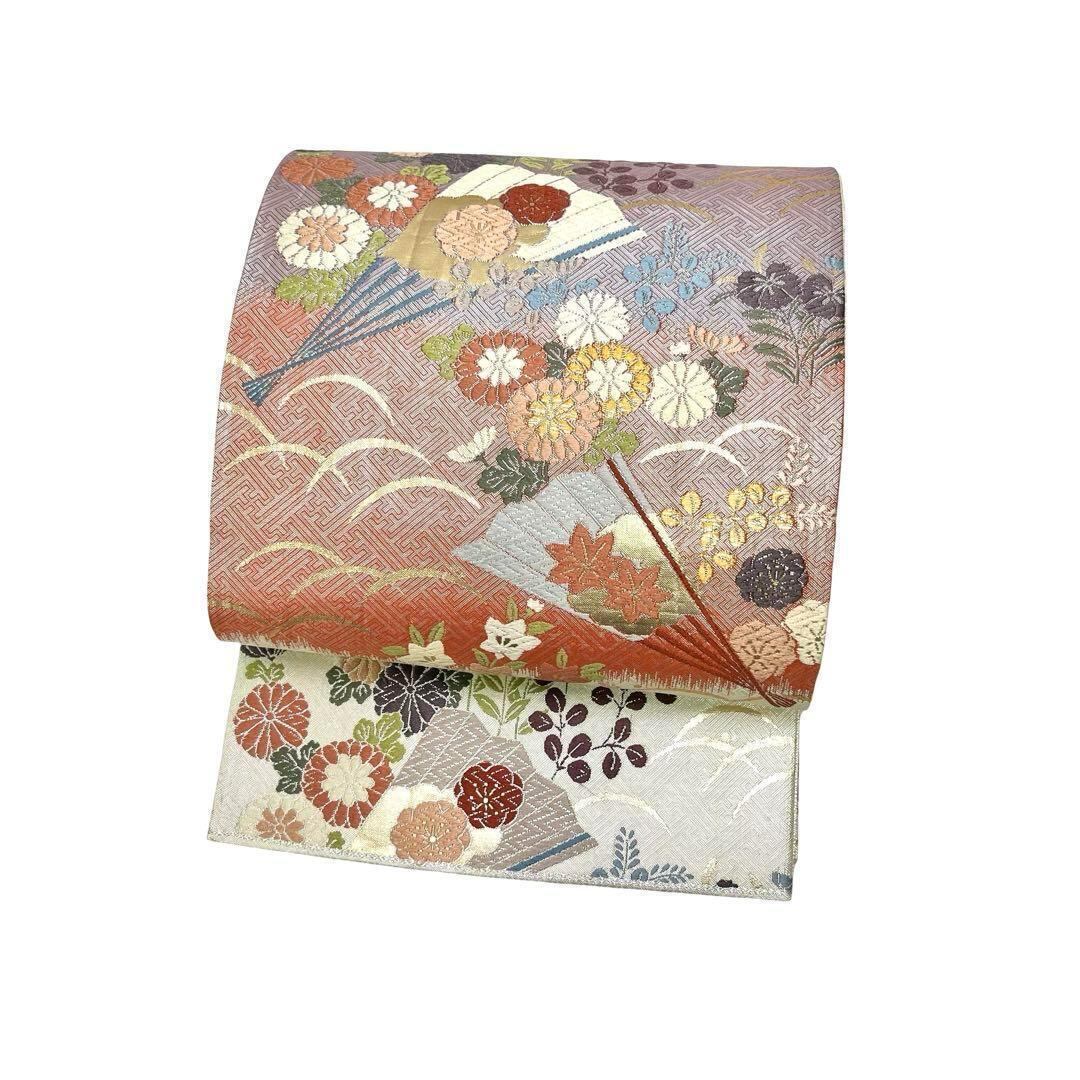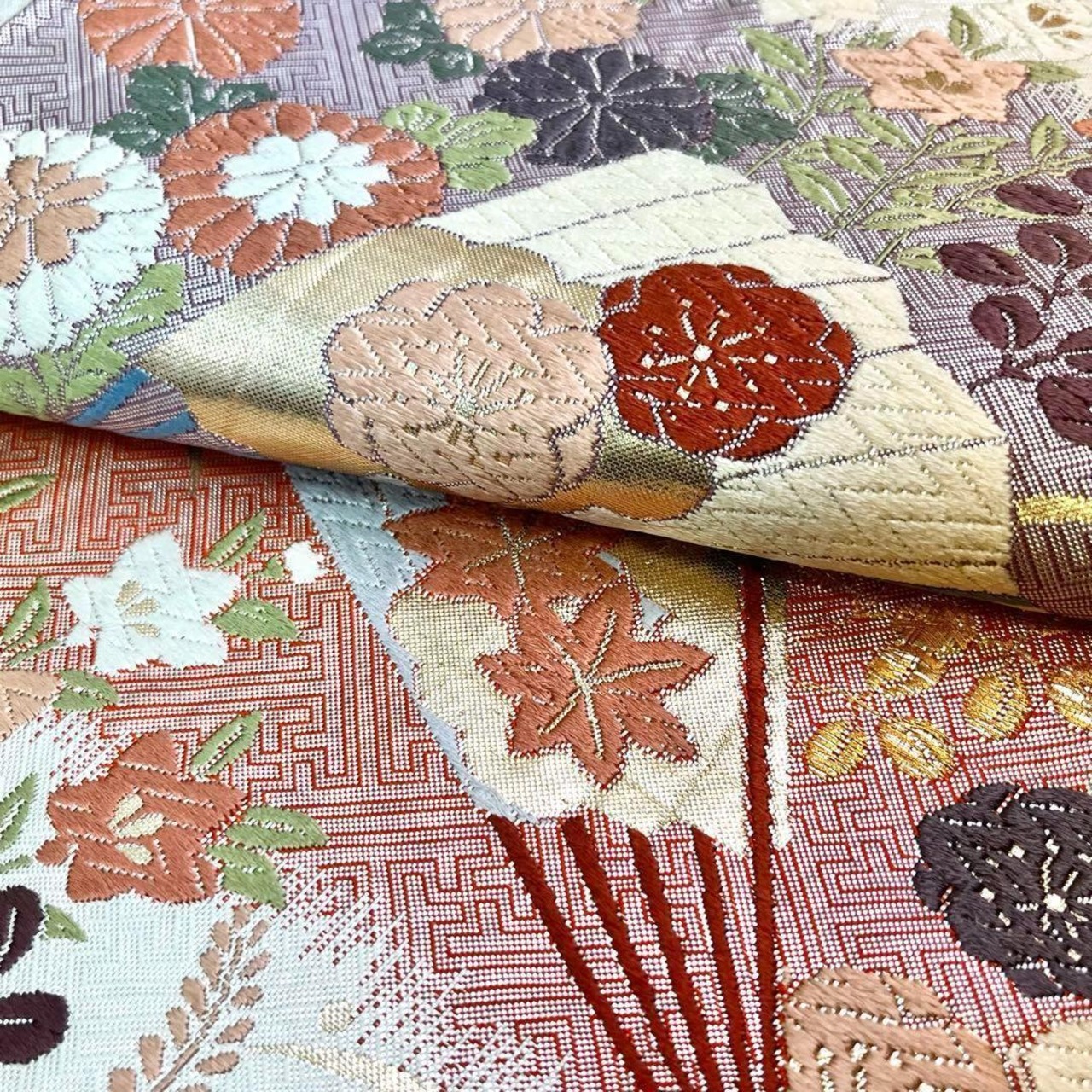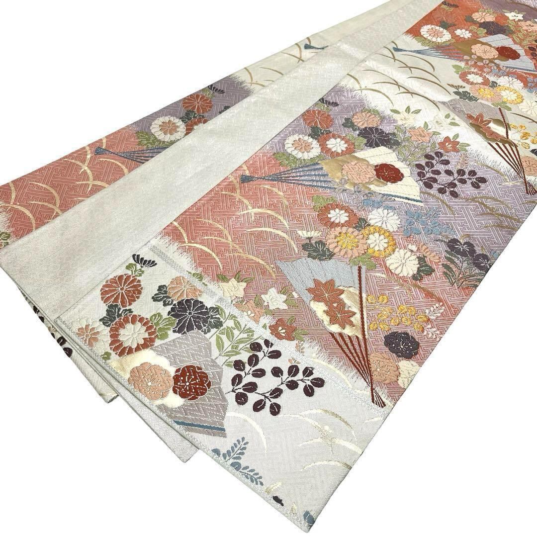 白百合色ベースのお色に横段グラデーション、扇子に四季の花模様がデザインされた素敵な柄裄のお品でございます。