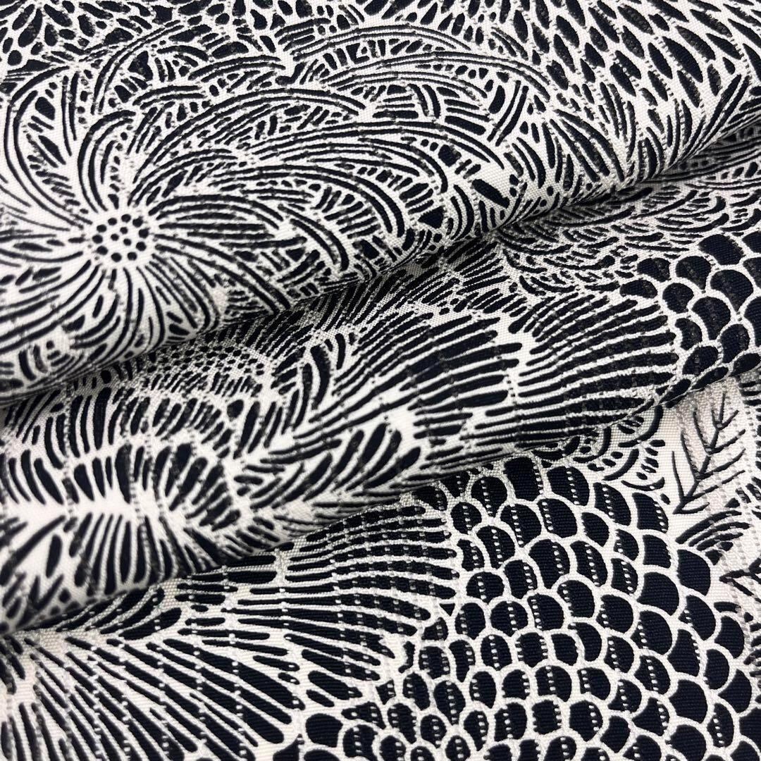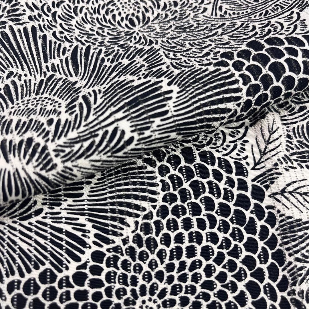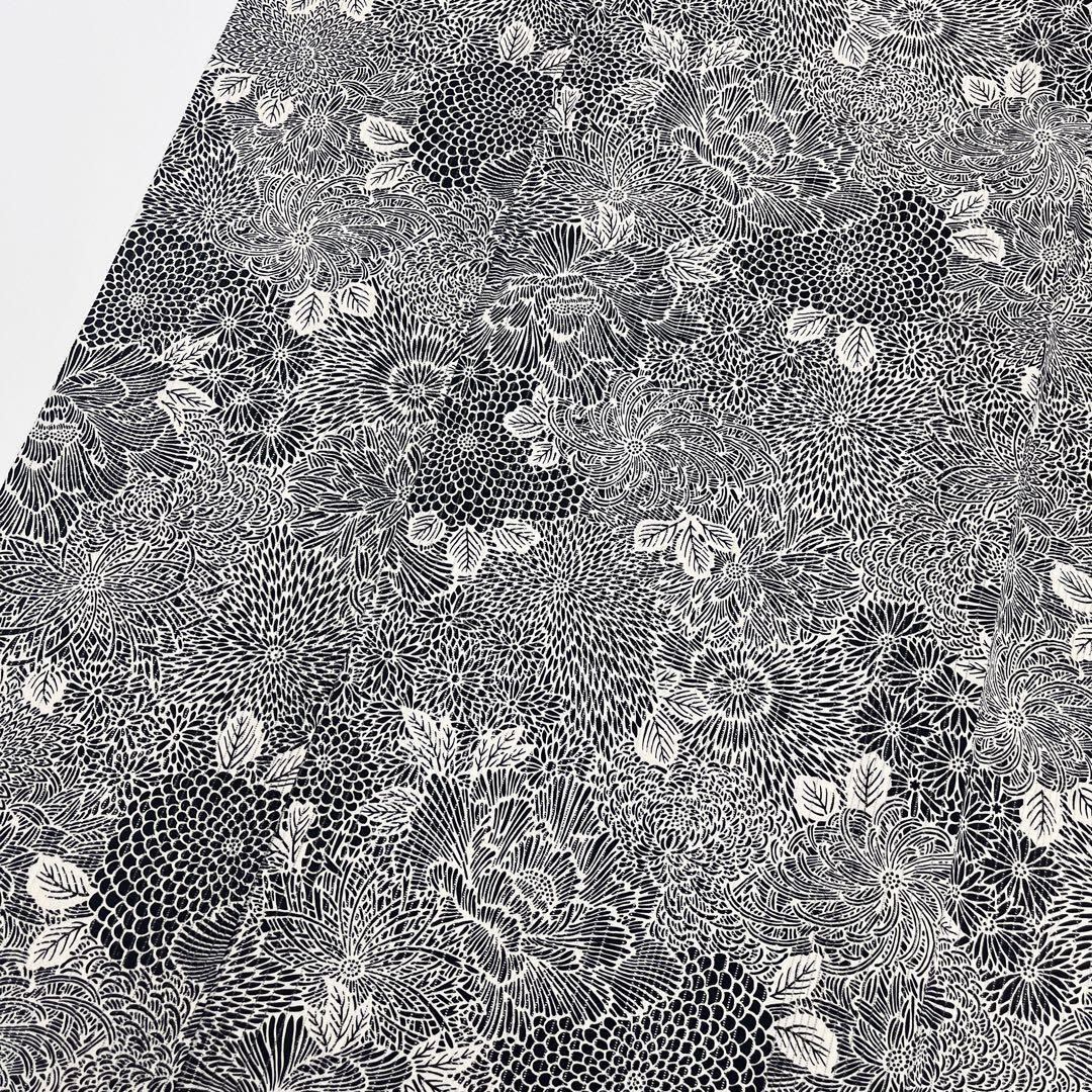 モノトーンのお色味に型染の牡丹と菊の花模様がデザインされたモダンな雰囲気の素敵な柄行のお品でございます。